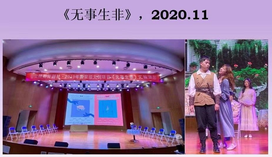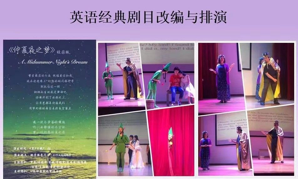 戏剧大创项目从2016年开始,已连续滚动开展了七年。前三年,我们改编、排演了英国戏剧史上三位最伟大的戏剧家的经典剧作,莎士比亚的《仲夏夜之梦》、萧伯纳的《皮格马利翁》和王尔德的《认真的重要性》。从2019年开始,项目聚焦莎士比亚,先后改编排演了《无事生非》、《皆大欢喜》、《威尼斯商人》和《第十二夜》,完成了莎士比亚四大喜剧的舞台再现。其中,《皆大欢喜》的片段演出参加2022年首届“友邻”杯莎士比亚(中国)大学生戏剧节比赛,荣获了大学生英文组的二等奖(亚军)。