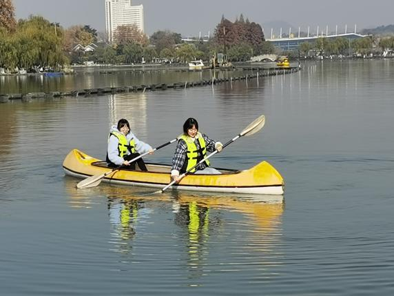 帆船实践过后,学员们在教练的指导下两两组队登上了皮划艇。与帆船运动不同的是,皮划艇与水面更为接近,更考验同学们的心理素质,但学员们迅速进行了自我调适,克服了恐惧心理,很快便体悟到 “一叶扁舟波万顷”的乐趣。