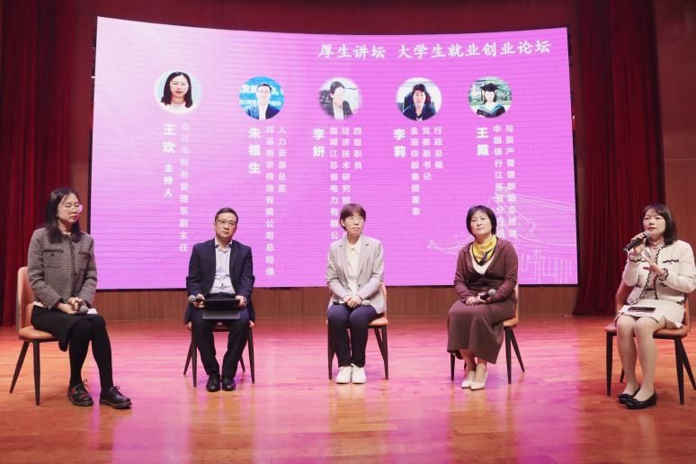 11月3日上午,群芳女生节之大学生就业创业论坛暨厚生讲坛第十三期”在广乐楼音乐厅成功举办。此项活动将学校校友会“最美校友母校行”等品牌活动与百家乐平台的校友“厚生讲坛”、群芳女生节之“巾帼标兵走进南师”相融合,邀请了全国五一巾帼标兵、国网江苏省电力有限公司经济技术研究院设计中心四级职员李妍,金箔控股集团董事、党委副书记、行政总裁李莉,中国银行江苏省分行投资银行与资产管理部副总经理王霞,邦基(南京)粮油有限公司总经理、人力资源总监朱福生四位巾帼劳模、女企业家、杰出校友现场分享职业发展经验与个人成长心得,共话促进大学生高质量就业。金女院党委书记薛传会、副书记高见、副院长杨素萍、会计与财务管理系副主任王欢以及金女院、社发院、商百家乐平台、公管院、物科院等百家乐平台本研学生一同参与。活动由高见主持。