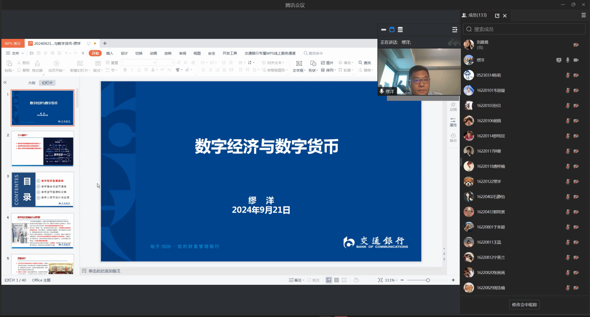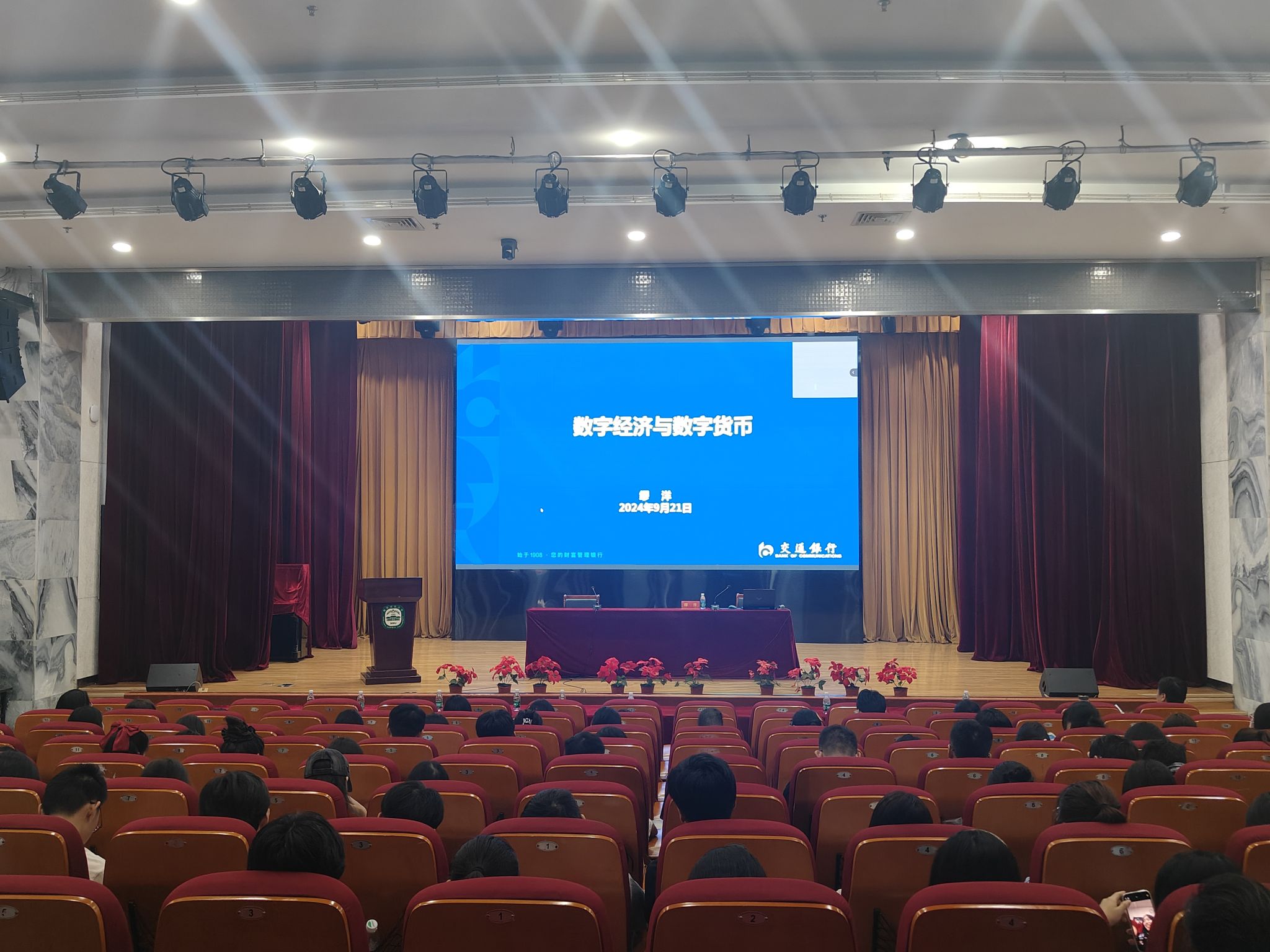 本研学子“厚生讲坛”第十二期暨贻芳书院五育素养讲座活动顺利举行。本次活动在贻芳报告厅举行,采用线上线下相结合的方式开展,金女院杰出校友,交通银行江苏省分行党委委员、副行长缪洋受邀作为主讲嘉宾线上开讲,讲座聚焦“数字经济与数字货币”这一热点话题。本次活动由金女院副院长封思贤主持,全体研究生及2021-2023级本科生线上线下参会。