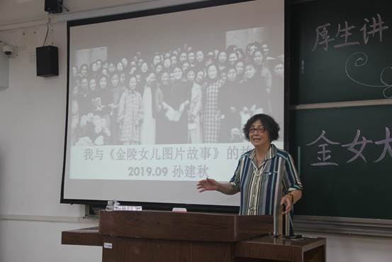 的历史,并为同学们介绍了孙建秋教授。孙教授于1950年读于金女大附中,母亲吕锦瑷毕业于金女大化学系,父亲孙明经曾任金陵大学影音部主任,是我国电影教育家,摄影家。孙建秋教授今天带来了主题为“我与《金陵女儿图片故事》”的宣讲会。以自己的亲身经历,生动地为大家讲述了她与金女大的故事。