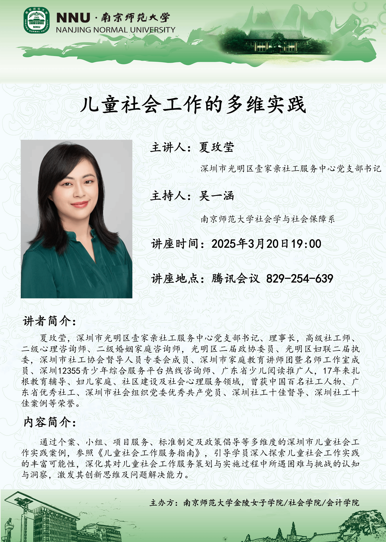 为庆祝第十九届国际社工日,2025年3月20日,社会工作专业组织了主题为“儿童社会工作的多维实践”的行业讲座。此次讲座特邀深圳市光明区壹家亲社会工作服务中心党支部书记、理事长夏玫莹老师担任主讲人。讲座内容涵盖社会政策倡导、标准制定等,并探讨各类服务在儿童社会工作中的具体实践。多位老师和40多名社会工作专业硕士研究生参与了本次讲座。