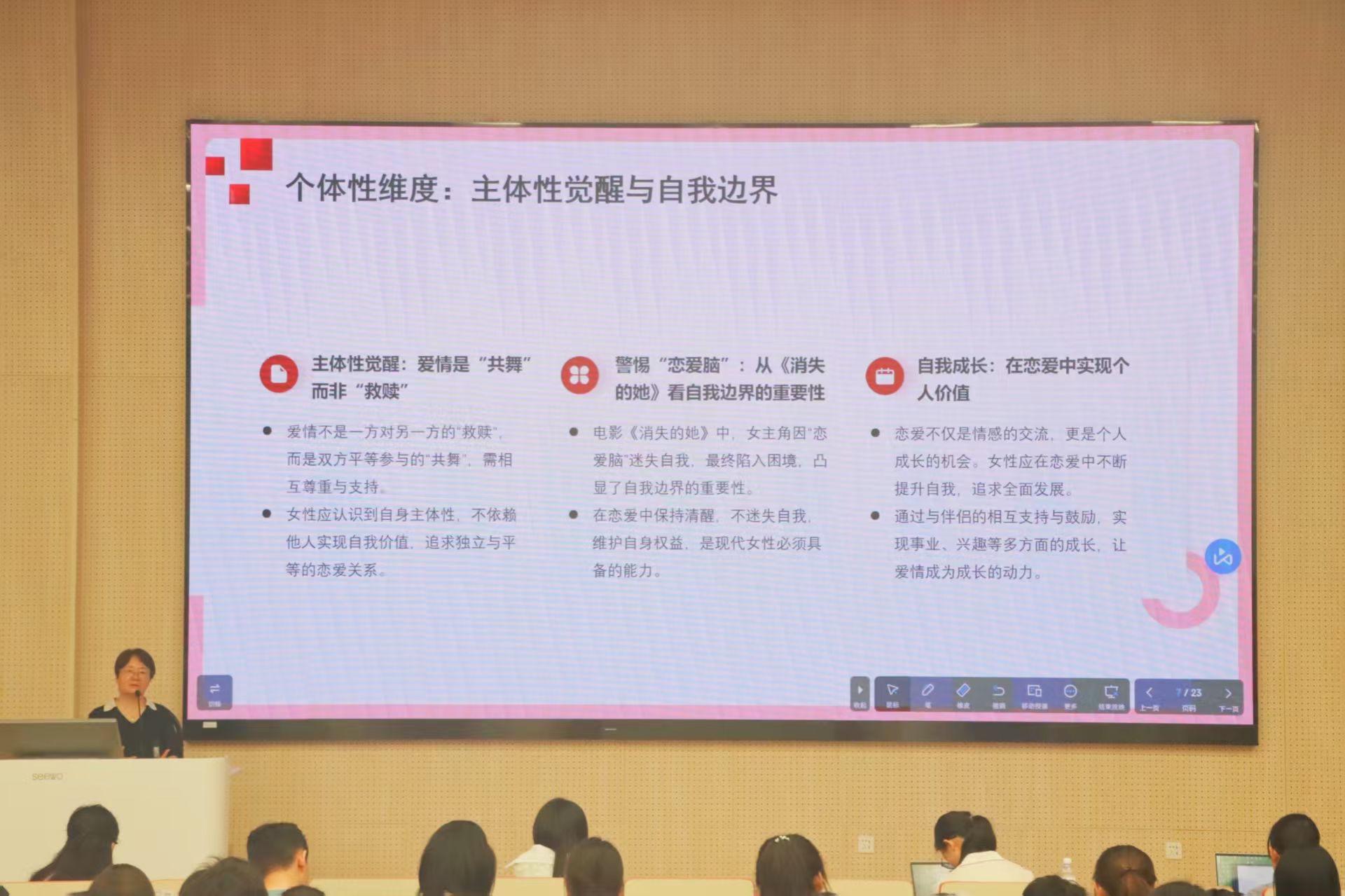周红以“‘我’与‘我们’的辩证法”为切入点,深入探讨了新时代女大学生重构婚恋价值的重要性和现实意义。她指出,95后、00后的年轻一代既渴望爱情,又对婚姻存在恐惧。一方面,她们内心憧憬着爱情的美好,在社交媒体上,有关爱情的话题热度不减;另一方面,一想到共同生活,她们又害怕不已,甚至提出只恋爱不结婚的想法。在亲密关系中,这种矛盾具体表现为“贤妻良母”与独立大女主的冲突。如何在自我价值与亲密关系之间取得平衡是难以解决的问题。