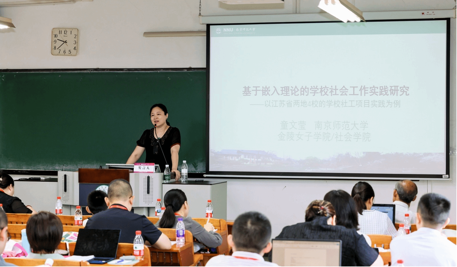 童文莹副教授在“从专业到卓越:高级社会工作人才培养的高质量发展”分论坛,以《基于嵌入理论的学校社会工作实务研究——以S校M社工项目为例》为题做报告。该研究运用嵌入理论,从嵌入的筹备期、嵌入适应期以及嵌入发展期等方面分析学校社会工作者的困境以及嵌入行动,并提出了相应的路径建议。此外,童文莹副教授担任了该分论坛第二单元“高级社会工作人才培养的核心要素与理论建构”的点评人,从理论建构的生态效度、研究方法设计等方面,对第二单元4位师生的报告进行了点评。