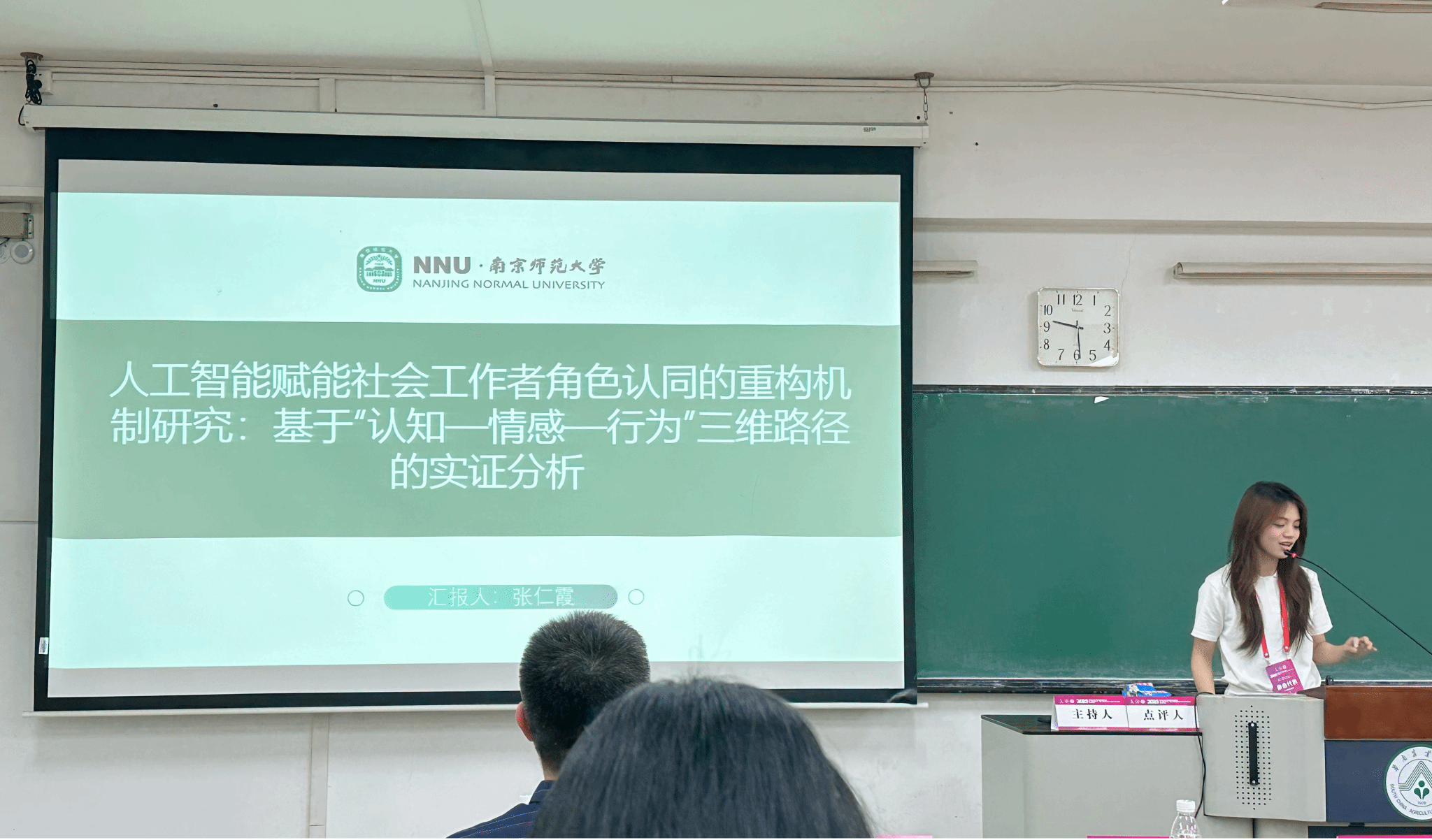 在“数智化社会工作”分论坛上,2024级社会工作专业研究生张仁霞在周慧泉教授的指导下,以《人工智能赋能社会工作者角色认同的重构机制研究:基于“认知-情感-行为”三维路径的实证分析》为题作报告。该研究通过对T市279名社会工作者的调查发现,人工智能技术显著形塑职业功能,但从业者危机感知较低,并从个体、组织和社会三个层面提出了人工智能时代社会工作者角色认同的重构路径。