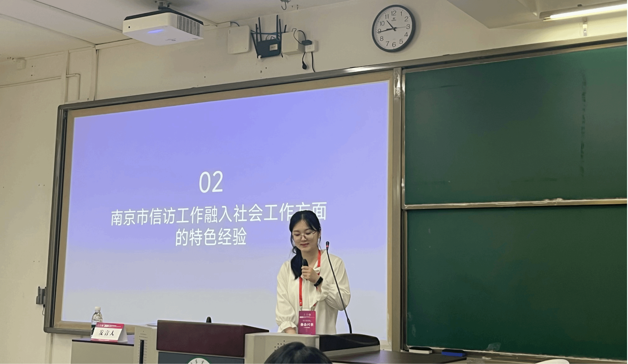 在“人民调解与信访社会工作”分论坛上,2024级社会工作专业研究生袁秋锦在童文莹副教授的指导下,以《信访工作融入社会工作体制机制研究——以南京市为例》为题作报告。该研究基于南京市实践,系统探讨了信访与社会工作跨体制融合的创新路径与区域经验,深入分析了当前面临的整合瓶颈与制度约束,并从机制构建、方法嵌入和人才培养等角度提出多项前瞻性对策。