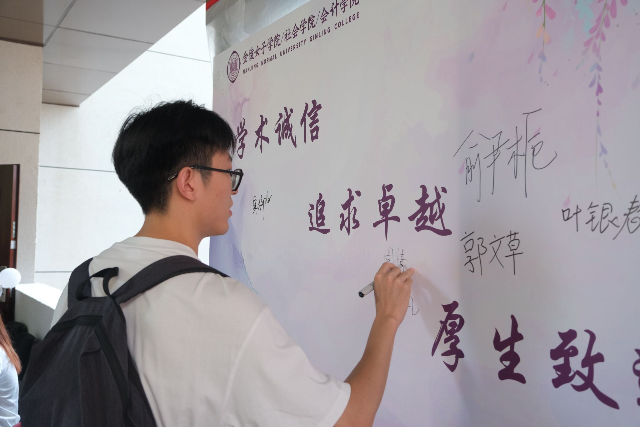 研究生迎新则以“学术诚信、追求卓越、厚生致远”为主线,通过“恪学笃行”“厚生永铭”“薪火赓续”三大板块,引导新生在签名墙前郑重立下严谨治学、笃行不怠的誓言;在纪念卡片上书写心愿与祝福,缅怀吴贻芳先生,传承“厚生”精神;同时邀请新生与家长在展板定格笑容,寄托对未来的美好愿景,开启崭新的研途篇章。