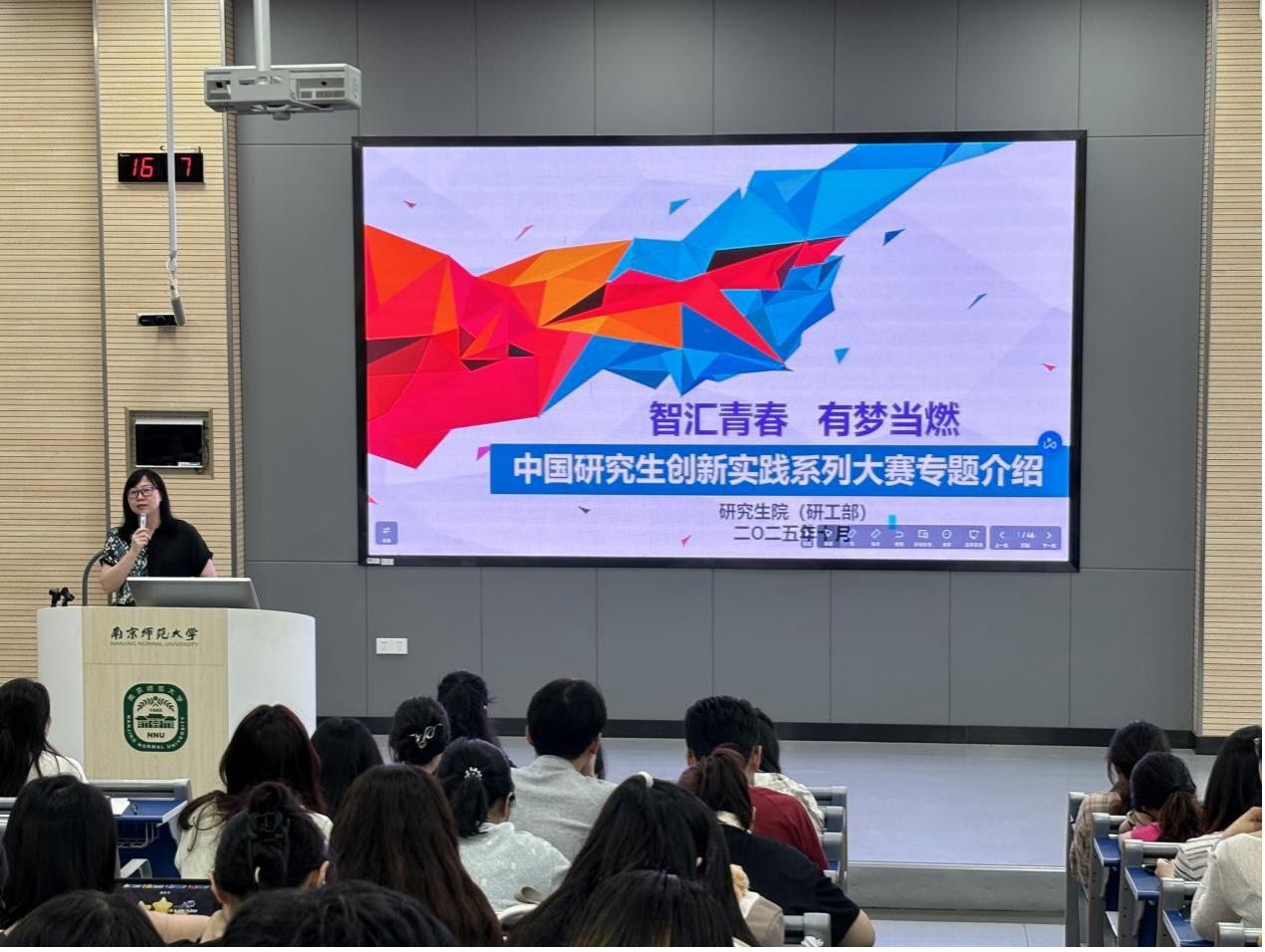特邀校党委研究生工作部副部长沈晓颖老师,为研究生新生作研究生创新实践竞赛专题讲座。百家乐平台党委副书记冯宁主持了本次活动。研究生辅导员葛茹及2025级全体研究生新生参会。