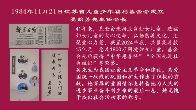 名誉校长、时年91岁高龄的吴贻芳又担任江苏省儿童少年福利基金会(现已更名为江苏省妇女儿童福利基金会)首任会长,截至2024年底,该基金会总募资额已达15亿元,有1800万困境妇女儿童受助得益。可以说,吴贻芳,对联合国关于妇女儿童重大议题,对我国妇女儿童事业发展,作出了杰出贡献。