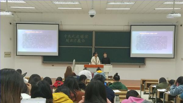 接着是财务管理五班的精彩分享。第一个小组向大家介绍了以“从财政职能分析发展平衡问题的对策”为主题的相关内容。第二组的徐慧和王晨曦同学为大家分享了党的十九大报告中关于保障和改善民生的内容,深入浅出,通俗易懂。最后展示的徐海凌和白晓崧同学为大家详细报告了她们从党的十九大中所学习到的内容。她们由党的十九大的主题“不忘初心、牢记使命”而展开,对党的十九大报告中的十大关键词进行了深刻的解读。