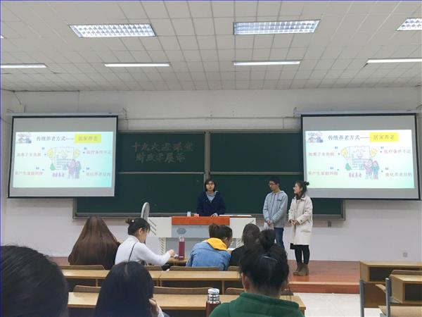 班的同学也不甘示弱,进行了有深度的展示。许欣怡小组向大家分享了“我国开征遗产税的必要性和可能性”,指出开征遗产税的必要性有增加财政收入、平均社会财富、削弱遗产继承观念三点。接着王迪和洪昊敏小组以“精准扶贫,不落一人”为主题对精准扶贫的含义、原因、典型案例、方向和实施进行了详细的说明,解读党的十九大中提出的“坚决打赢脱贫攻坚战”概念并介绍了我国将统筹做好“引进来”和“走出去”。最后周韵小组根据习近平总书记在党的十九大报告中指出的“深化投融资体制改革,发挥投资对优化供给结构的关键性作用”阐释了我国投资体制平台与历史沿革等四大方面的投资体制。活动的最后同学们爆发了雷鸣般的掌声。