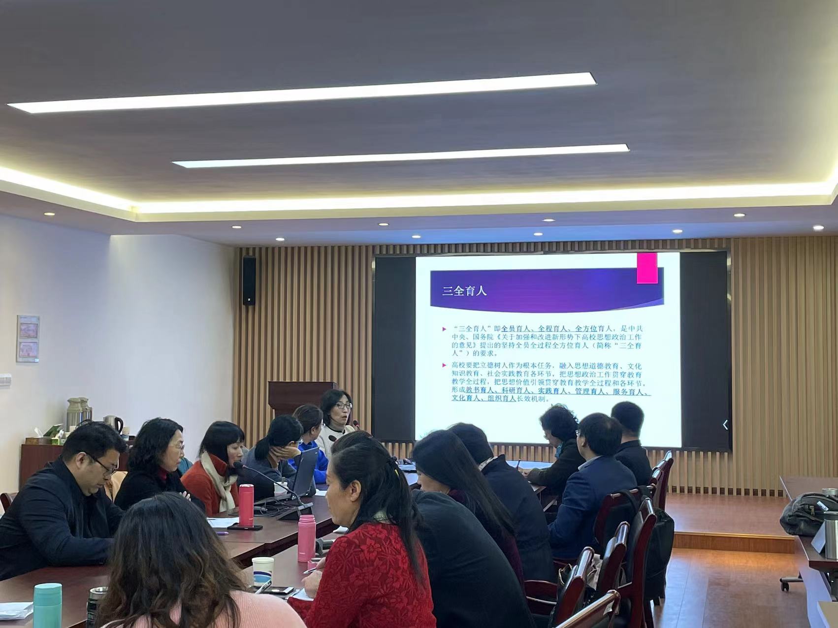 沙龙起初由朱运致主任简介了三全育人的思想内涵——全员、全程、全方位教育人、培养全面发展的人。朱老师还从课程角度探讨了合作式集体教育:《世界戏剧面面观》课程是校重点博雅课,系里组织了十人教学团队,各教授各有所长,所以大家设计了完整、有机一体的教学计划。此外,朱教授还介绍了《专业导论与探讨》、《中国文化概要》的整体写作在培养学生的过程中强化全方位育人的方方面面——培养学生对中国文明和文化的认同感,提高学生讲好中国故事的能力。对学生比赛的指导,采取专人专项负责制、轮岗带队参赛,分散带队负担的策略。朱教授还介绍了“协同式学生发展体系建设”的情况:采用年级主任制,一到四年级分别由曹晓旸、叶红、沈继荣、马黎燕等教授负责,中美联合办学班全部由秦海花教授负责。系里特别重视专业与学工、专业与教务、跨百家乐平台、百家乐平台与各处、百家乐平台与国内外的联系。