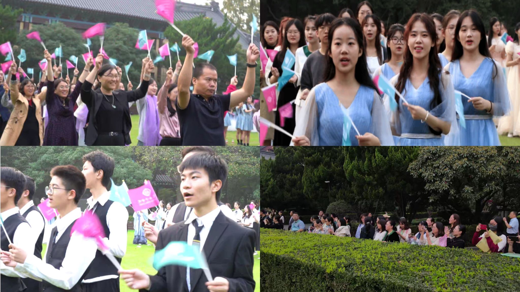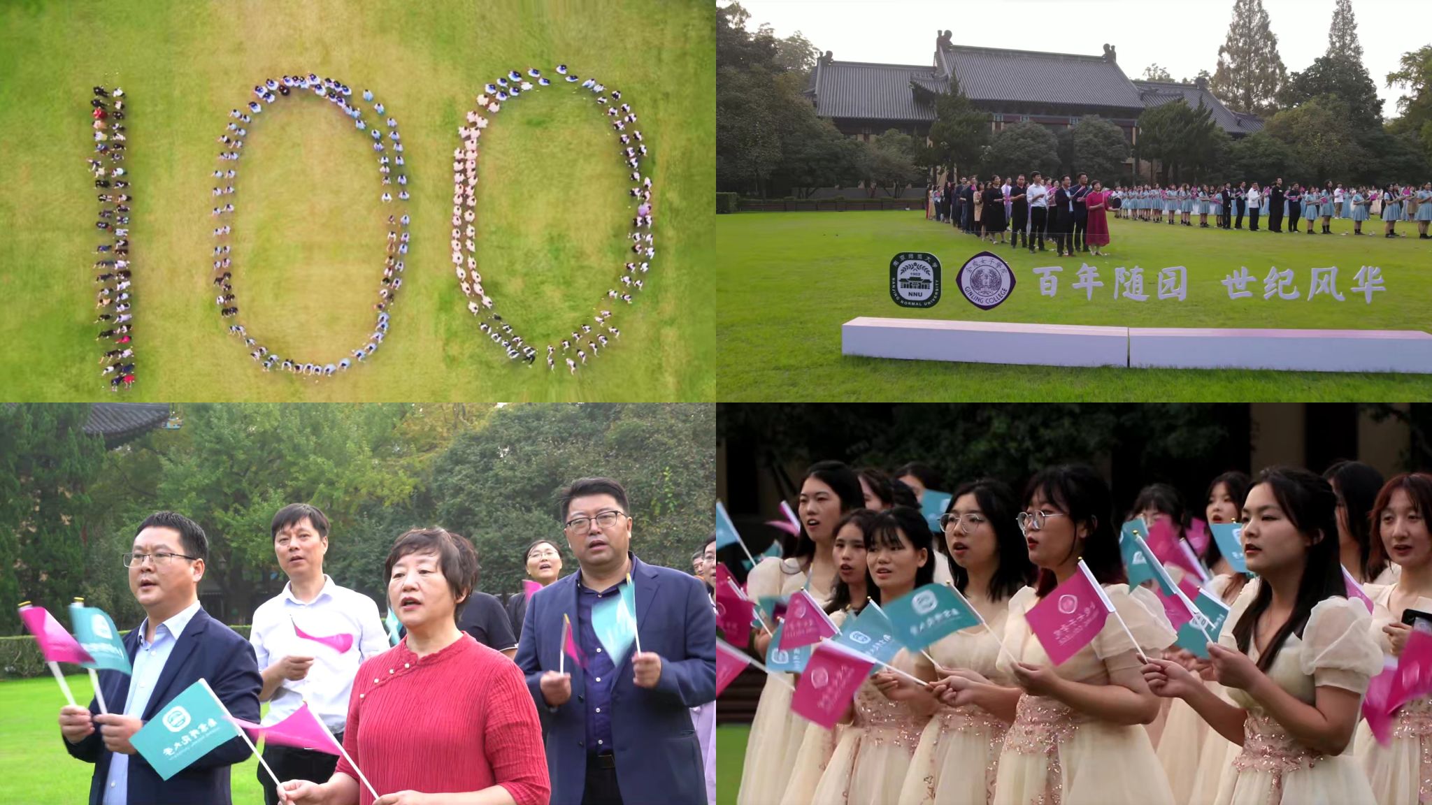 校旗和金女院院旗并逐渐组成“100”字样的队形,共同唱响《我们都是金陵的儿女》和《We are from Ginling》这两首承载着金陵女子大学历史的歌曲,抒发着金陵儿女对学校的无限热爱与眷恋。快闪活动引得路过师生纷纷驻足观看、拍照记录,体现了百年随园厚重的历史传统和文化血脉,也为学校“厚生”文化、爱校荣校文化等校园文化建设注入新活力。