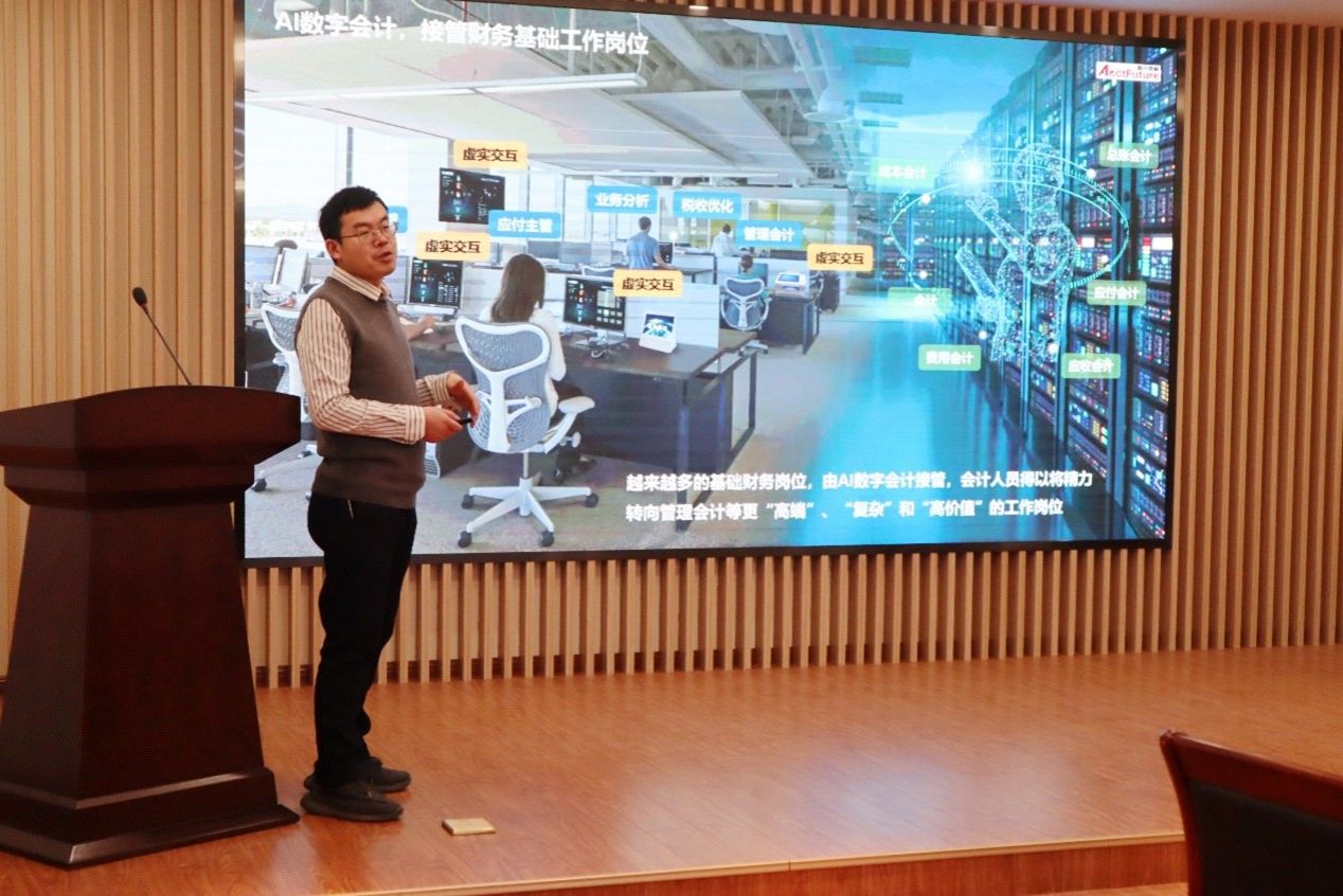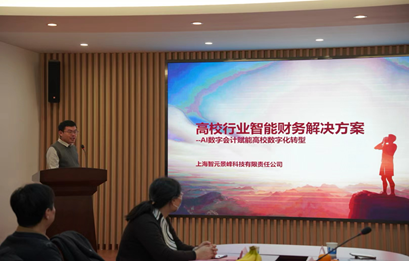 随后,合作单位上海智元景峰智能科技有限责任公司的总经理张光云和产教融合负责人刘轩呈项目进行发言。张光云详细介绍了“智元”财务大模型,结合案例从多方面指出该模型能为数字会计提供全面支撑;刘轩呈就“基于人工智能技术高校数字会计人才培养路径”进行了分享,着重说明高校可以进行校企合作将数字化融入本科教学中。