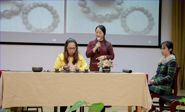 随后,黄老师把茶与养生紧密相连,为大家介绍了茶的养生功效。茶为中心,益于肝、肺、脾、肾,并有少睡、止渴生津、清热解毒、消暑安神的功效。同时,茶兼具有愉悦心情、延年益寿的功效。她还指出:“天造茶字蕴道深。古人造字的时候似乎就把茶中的养生之道蕴含在字中。古时的茶字左右对称,对称意味着协调,协调意味着美。茶是开放的,茶性之包容让人亲近。”黄老师耐人寻味的讲解使大家体味到了茶浓浓的“禅”味。