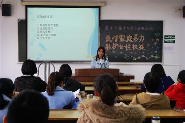 3月28日下午4点,金女院第十六期女大学生发展论坛在学明楼409顺利举办。本次发展论坛以《反家暴法》为主题,与会选手从反对家庭暴力和维护女性权益角度,互相交流了对于《反家暴法》的看法与反思。