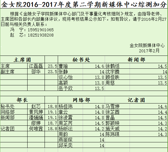 金女院2016-2017年度第一学期新媒体中心综测加分公示