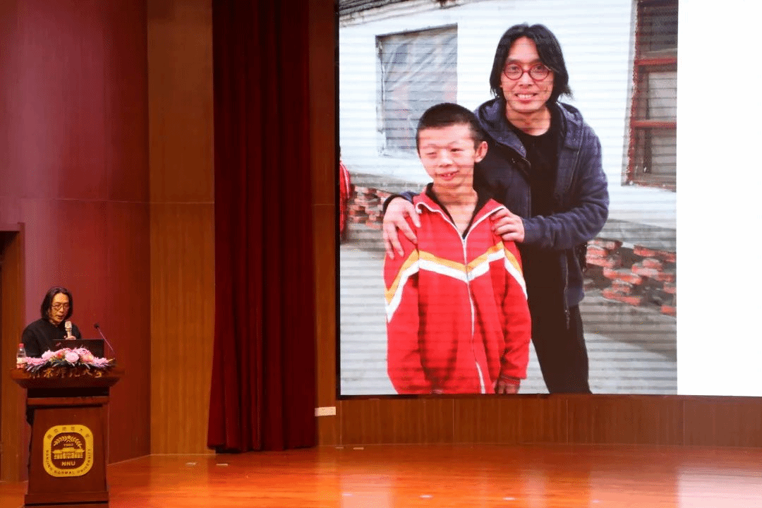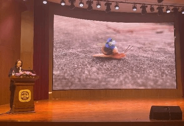 朱赢椿老师以“转念见美”为主题,主要通过“自然之美”、“瑕疵之美”、“丑陋之美”等概念阐述了“美”的内涵。讲座伊始,朱老师通过讲述《蚁呓》、《虫子诗》、《虫子旁》等作品的灵感来源和创作过程,指出“自然之美”的要义:不要以为人多高尚,蚂蚁有多卑微。趴下来与大地接触,大地也会给你回馈。