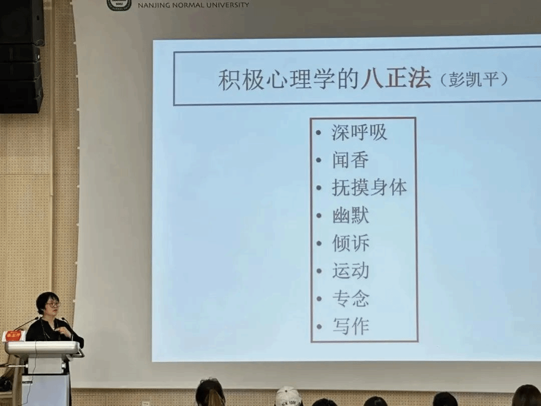 随后,桑教授通过积极心理学为同学们介绍了心理坚韧的三个境界:复原力,弹性,茁壮成长。桑教授通过不同人对同件事的不同反应告诉同学们,可以通过“八正法”、“光明思维法”调整自身状态,从而达到自身的心理认可。她还提到,面对生活中不可控的因素,同学们应该从心理上承认它,默许它,首先做到情绪上不为它所扰,然后再找出应对和改进的措施。而对于幸福感的获得,桑教授则给予了几点建议:悦纳自我、面对挫折、保持乐观。