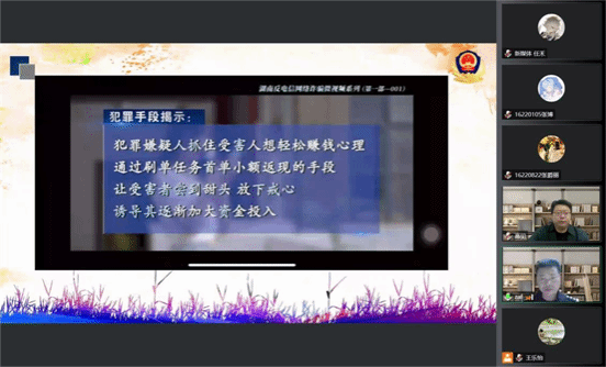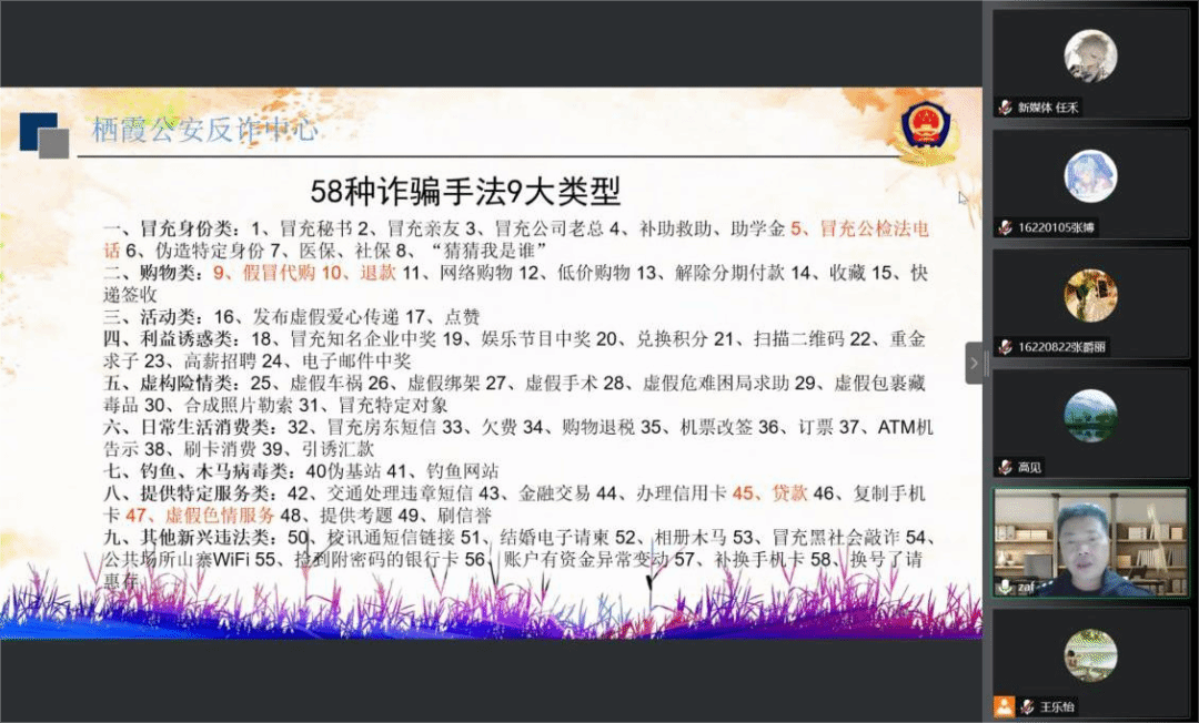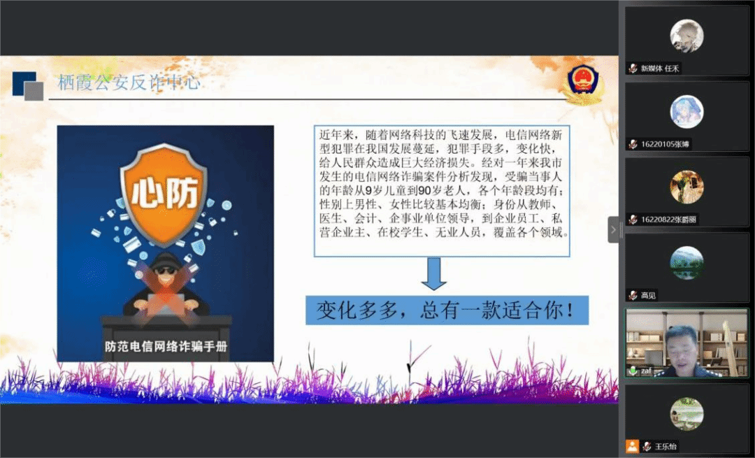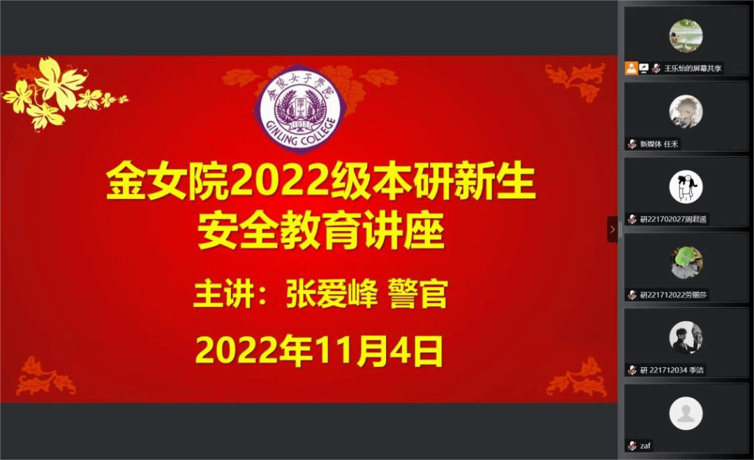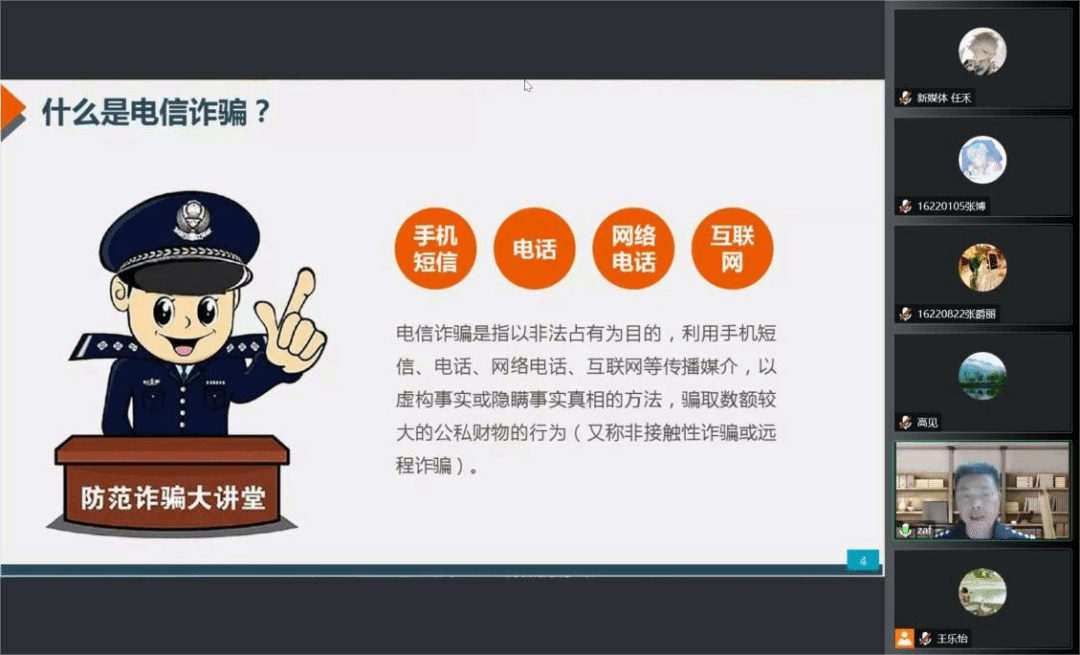 面向2022级本研新生召开以反电诈为主题的线上安全教育讲座。本次讲座邀请仙林派出所一级警长张爱峰警官担任主讲人,院党委副书记高见出席并主持此次活动。