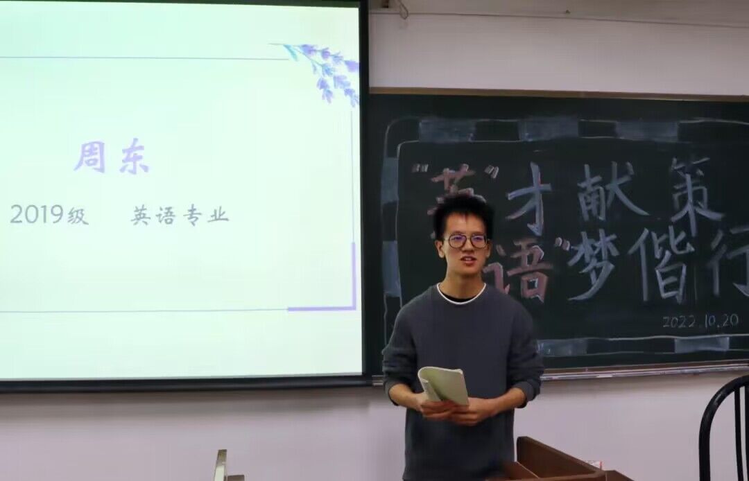 19级英语专业本科生,目前推免至上海外国语大学语言学专业,获2022年国家奖学金。在校期间,曾担任院学生会文体部副部长;参与省级大创项目并顺利结项;曾获院运动会男子100米、400米第一名。