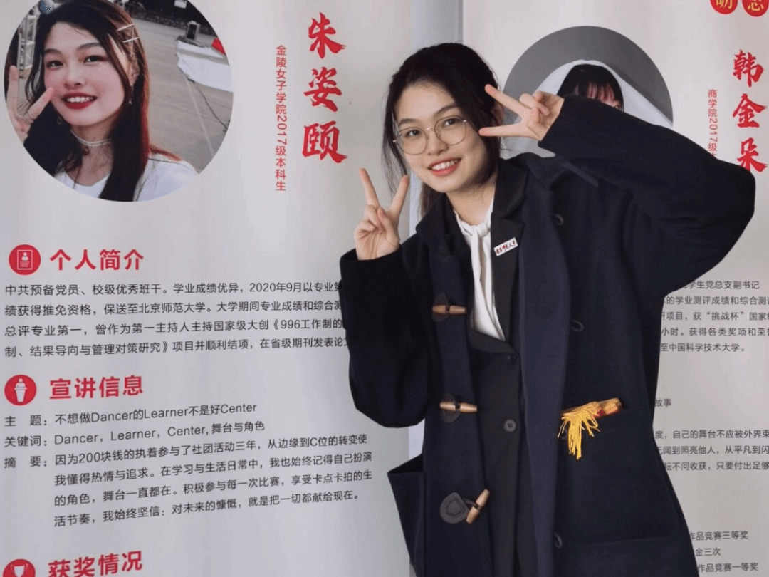 朱姿颐一直坚信学习和社团从来不是对立的两个东西。她将learner作为主业,dancer作为副业。她认为追求爱好是一件很自然的东西。更重要的是,她认为是跳舞让自己更加自信、从容与投入地去对待学习与生活,将dancer精神带入learner生活。她会很享受这种卡点、卡拍的生活节奏,喜欢这种忙碌而又充实的生活。尽管心爱的跳舞占据了她许多时间,朱姿颐始终没有忘记自己是一名学生。她在图书馆、体育馆、食堂之间来回奔波,在不同的角色之间自如切换,最终换来专业成绩与综合测评均专业第一、平均成绩90分的好成绩,保研到北京师范大学。她用一贯投入的热情,平衡了Learner和Dancer这两个截然不同的角色。