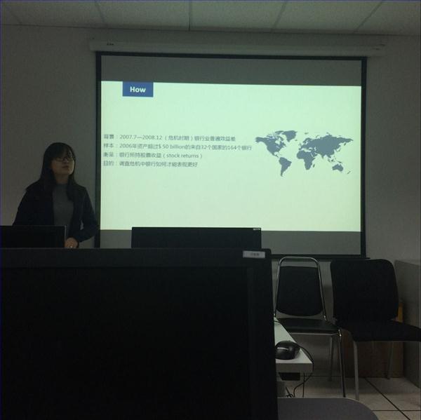 在作简短总结后,研究生兀彤同学汇报了“The Credit Crisis around the Globe: Why did Some Banks Perform Better ?”这篇有关金融危机中不同银行业绩存在显著差异的影响机制。兀彤同学用全英文的方式完整展示了文章的总体结构,并对文章中的关键知识点以百科知识的形式进行了清晰梳理。兀彤同学的汇报方式改变了之前研究生汇报只采用中文的方式,大胆尝试英文的方式进行学术汇报,有助于提高研究生参与国际学术交流的能力。对于这种汇报方式,与会老师均表示积极肯定。此外,江希和教授、赵自强教授、柏檀副教授等均对文章的结论进行了深入的讨论,对与会师生均产生较多的思路和启发。