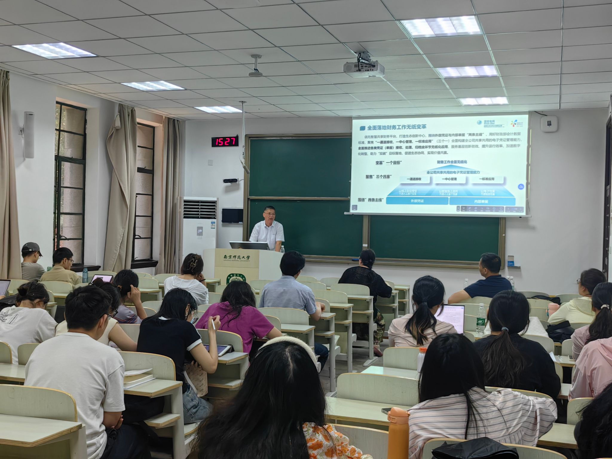 2024年6月14日下午,金女院在随园校区北大楼107教室成功举办了厚生讲坛第十期活动。本次讲坛主题为“财务数智化转型探索与实务”,由国网江苏省电力有限公司财务资产部副主任郑祥华高级会计师主讲。讲坛由熊筱燕教授主持,金女院特聘院长杨雄胜教授、会计与财务管理系教师、22级和23级研究生参加。