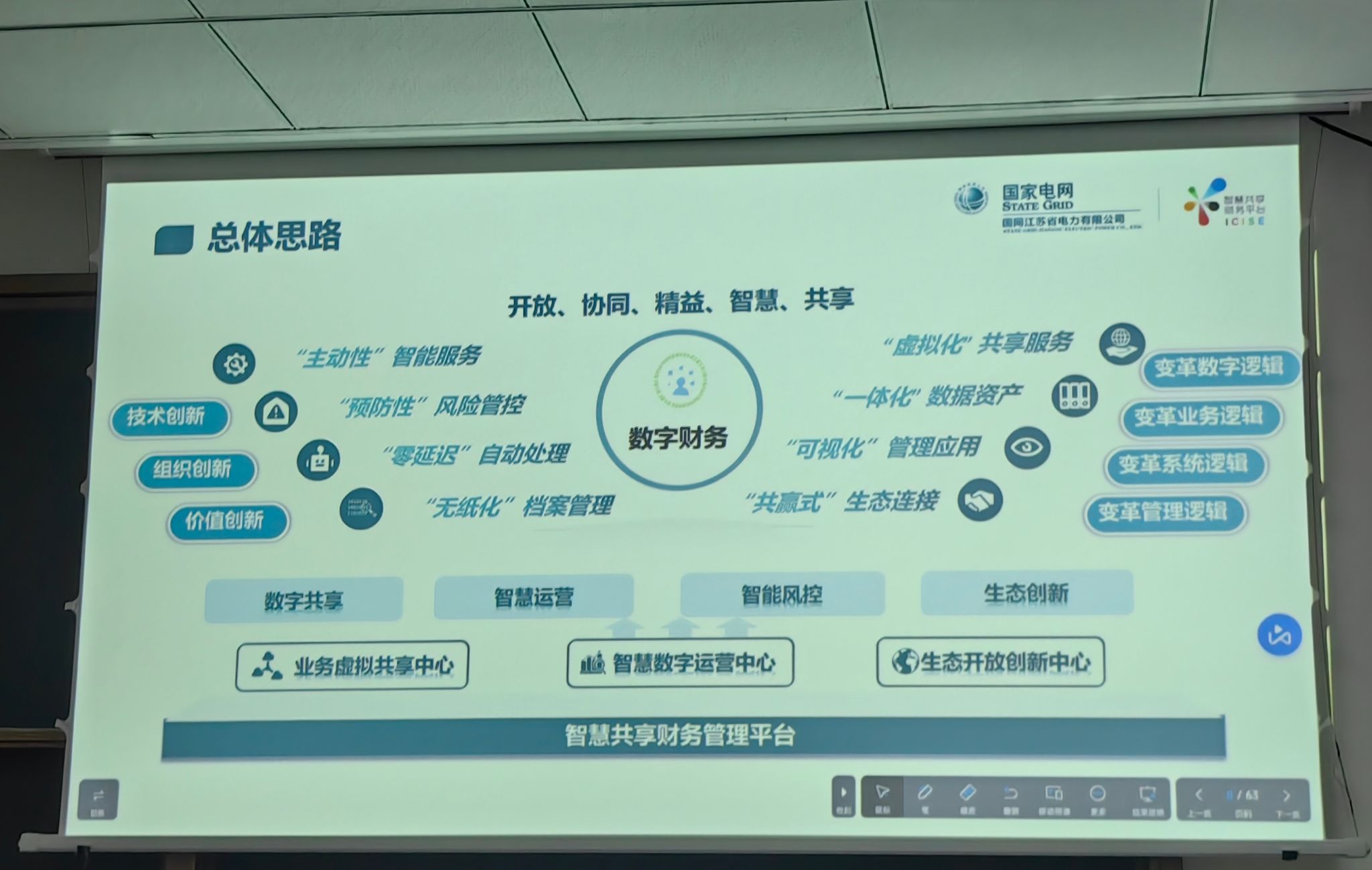 接着,郑祥华主任从内部和外部两个方面点明财务数智化转型升级是大势所趋。外部因素包括国家战略加速传统产业数字化智能化,推动数字中国建设;新型电力系统需求促进数字化转型;政府推动央企数字化转型和新基建政策提供机遇;云计算、人工智能等技术进步支持企业资源整合和业务敏捷响应。内部因素则包括“十四五”战略要求建设新型数字基础设施,通过业务中台推动电网生产、企业经营和客户服务创新;虚拟共享转型升级通过数字化技术实现标准化和集中化,推动业务敏捷高效。