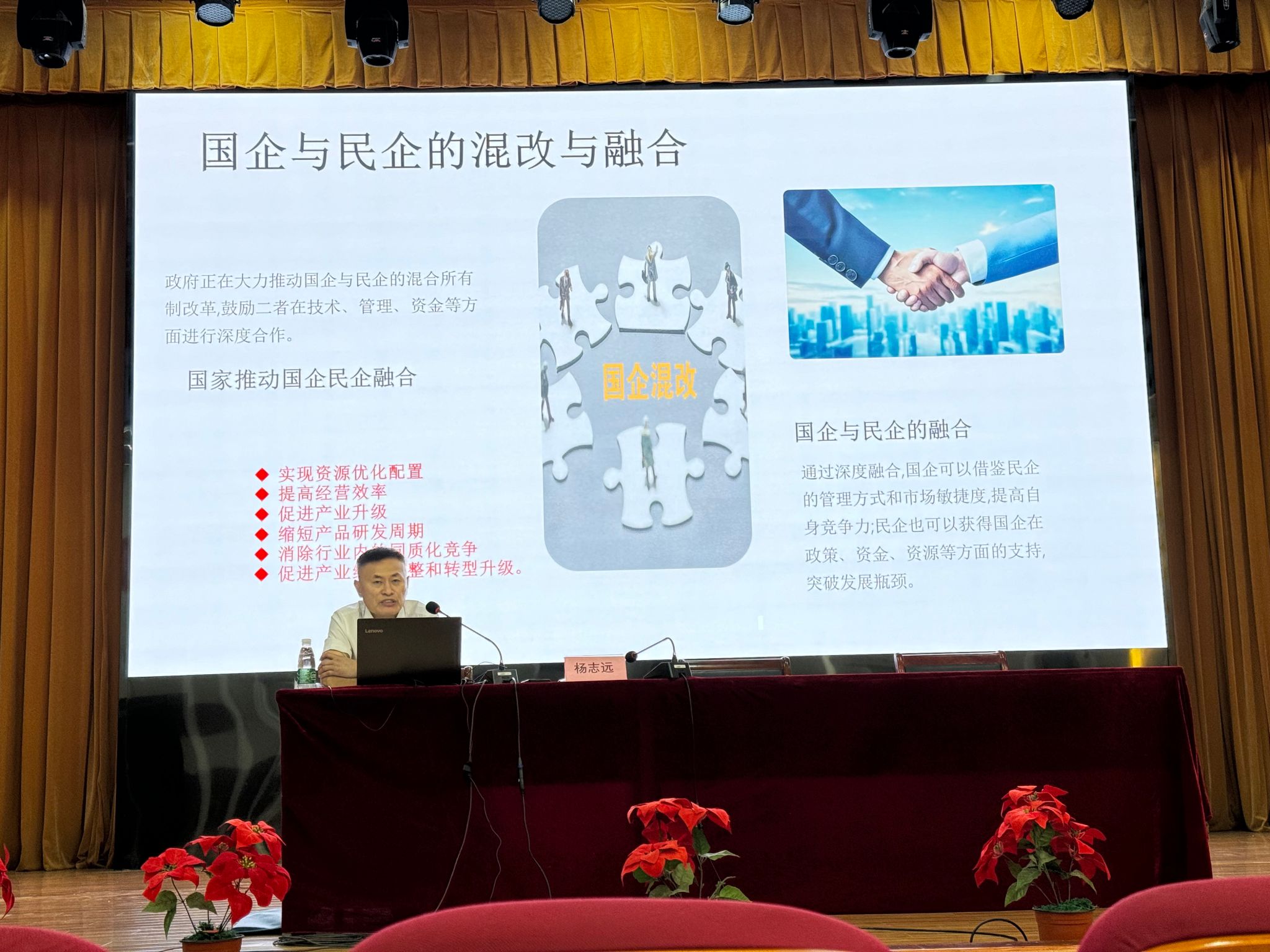 讲座伊始,杨总首先对国有企业和民营企业进行了概述,重点介绍了两者在股权结构、高管特征、公司治理、财务特征、市场敏感性、经营灵活性、创新能力、创新活力、社会责任履行等方面的区别。杨总认为,国企混改的本质是通过改革,使国有经济和其他所有制经济相互融合,使国有资本和民营资本一起做强做优做大,最终实现不同所有制企业、不同所有者代表之间的合作共赢。