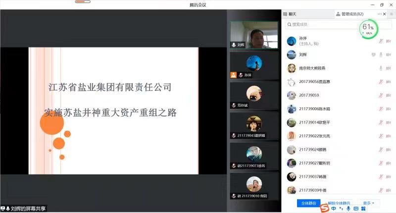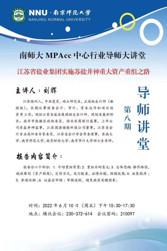 MPAcc中心第八期“行业导师大讲堂”学术报告会在线上隆重举行。江苏省盐业集团副总会计师、南京市鼓楼区政协委员、淮安农商银行监事、苏盐井神监事刘辉正高级会计师,作主题为“江苏省盐业集团有限公司实施苏盐井神重大资产重组之路”报告。院会计系熊筱燕教授主持报告会,会计系教师、会计专业硕士研究生参加。