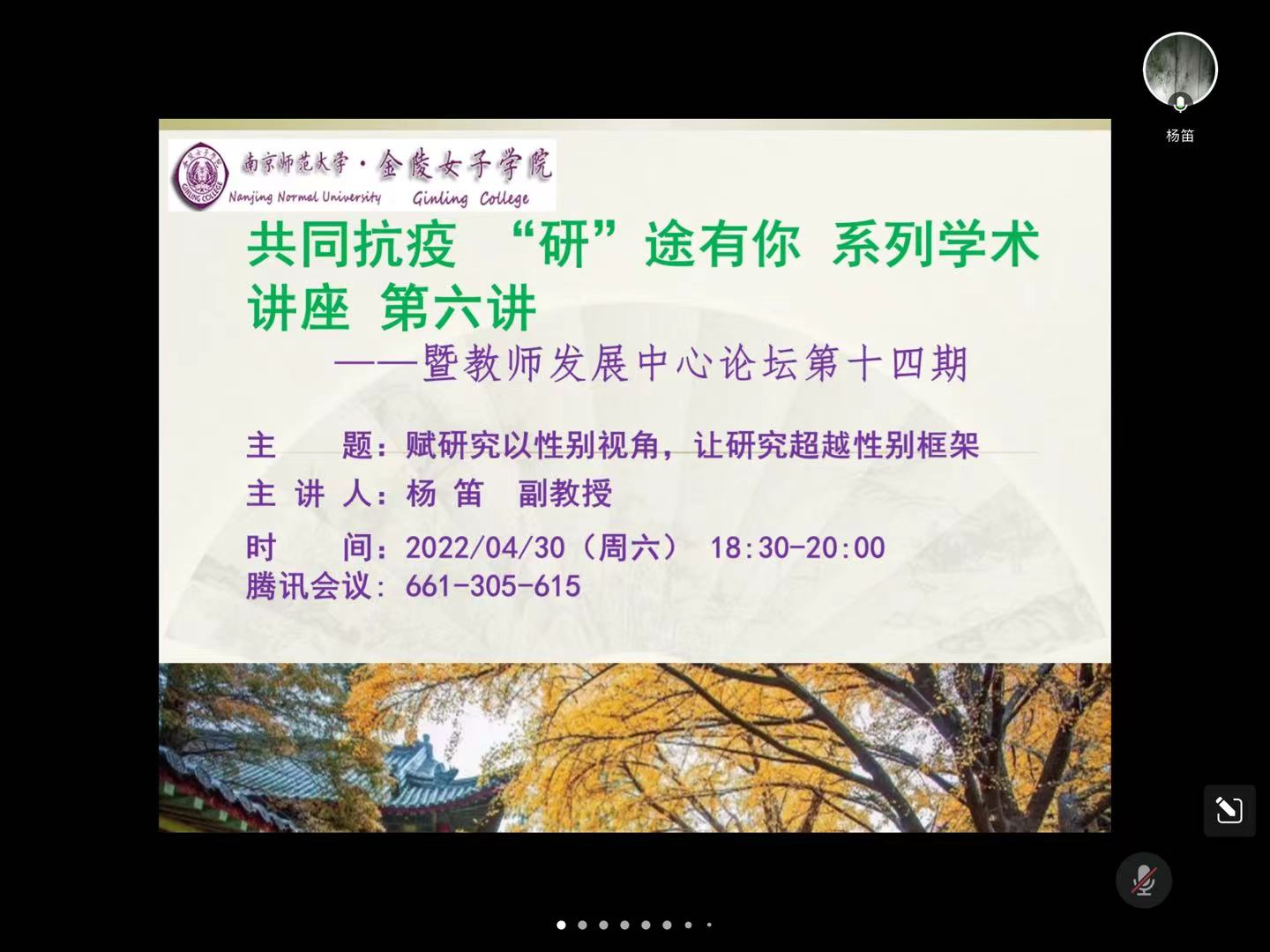 女性学系、劳动与社会保障系杨笛副教授,以线上会议的方式为校内外近200名师生带来“共同抗疫,‘研’途有你”系列讲座第六讲暨教师发展中心论坛第十四期讲座——“赋研究以性别视角,让研究超越性别框架”。本次讲座由百家乐平台