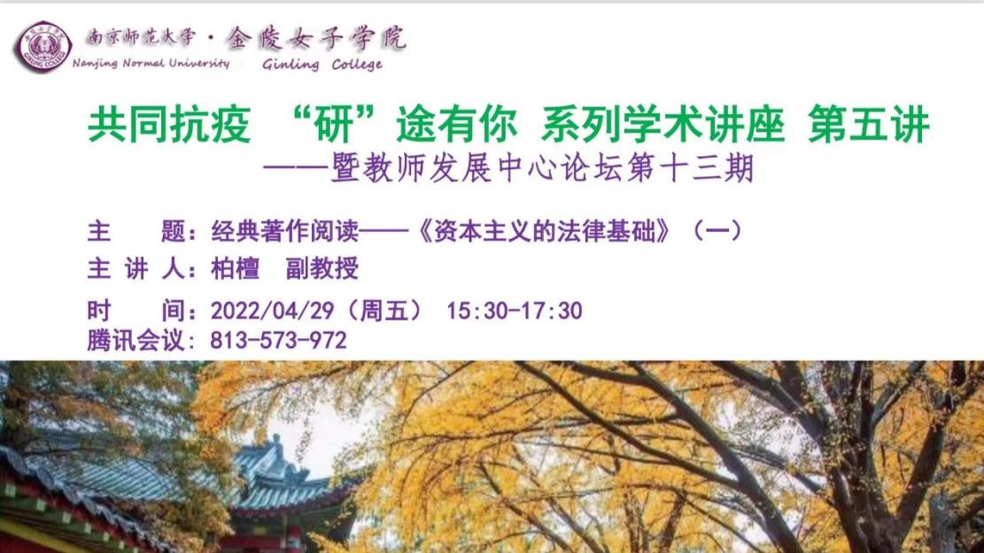 邀请了会计与财务管理系柏檀副教授,以线上会议的方式举办了“共同抗疫,‘研’途有你”系列第五期暨教师发展中心论坛第十三期讲座——“经典著作阅读——《资本主义的法律基础》(一)”。