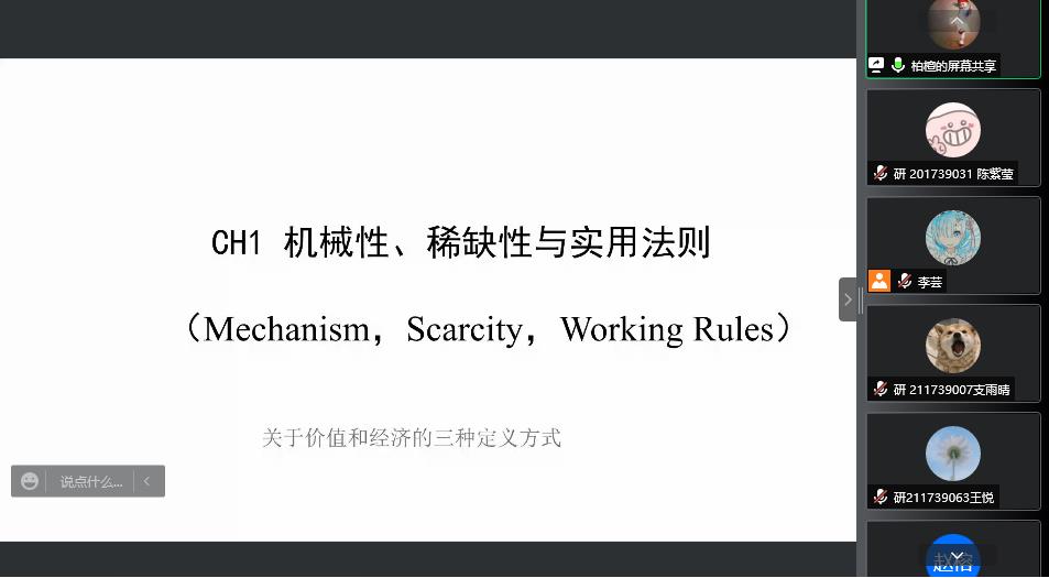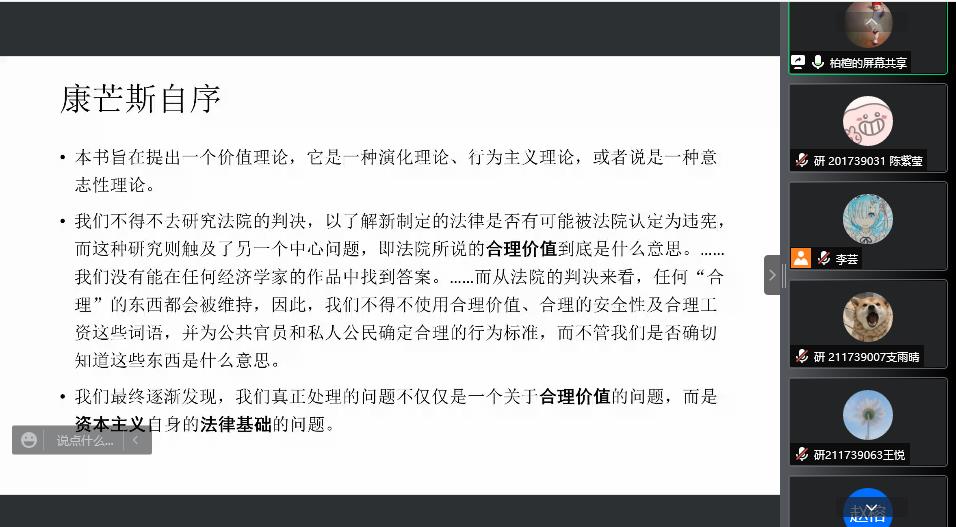 最后,金女院特聘院长杨雄胜教授、熊筱燕教授和封思贤副院长对柏檀老师表示了感谢,并对本次会议作了总结。各位老师均强调了阅读名著的重要性,其中杨雄胜教授认为作者康芒斯将很多学科均融合在一起,要想真正理解这本书,需要我们结合别的著作一起理解。同时建议同学们从会计和财务的角度来解读这本书,这样才能有更多收获。最后,本次会议在同学们评论区的热烈感谢中圆满结束。