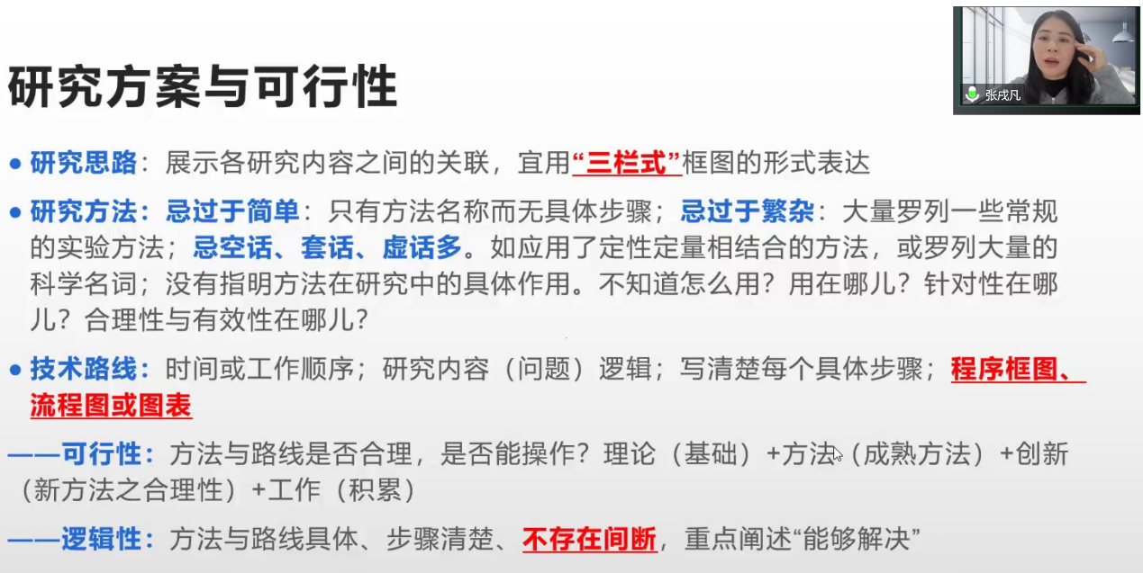 随后,张戌凡教授结合大量的申报书案例,重点从研究内容设计、研究目标细化、研究难点与重点分析、研究技术路线图设计,摘要、文献综述、科学问题属性等内容的撰写方面进行了详细分析,并就其中的诸多细节进行了提醒。