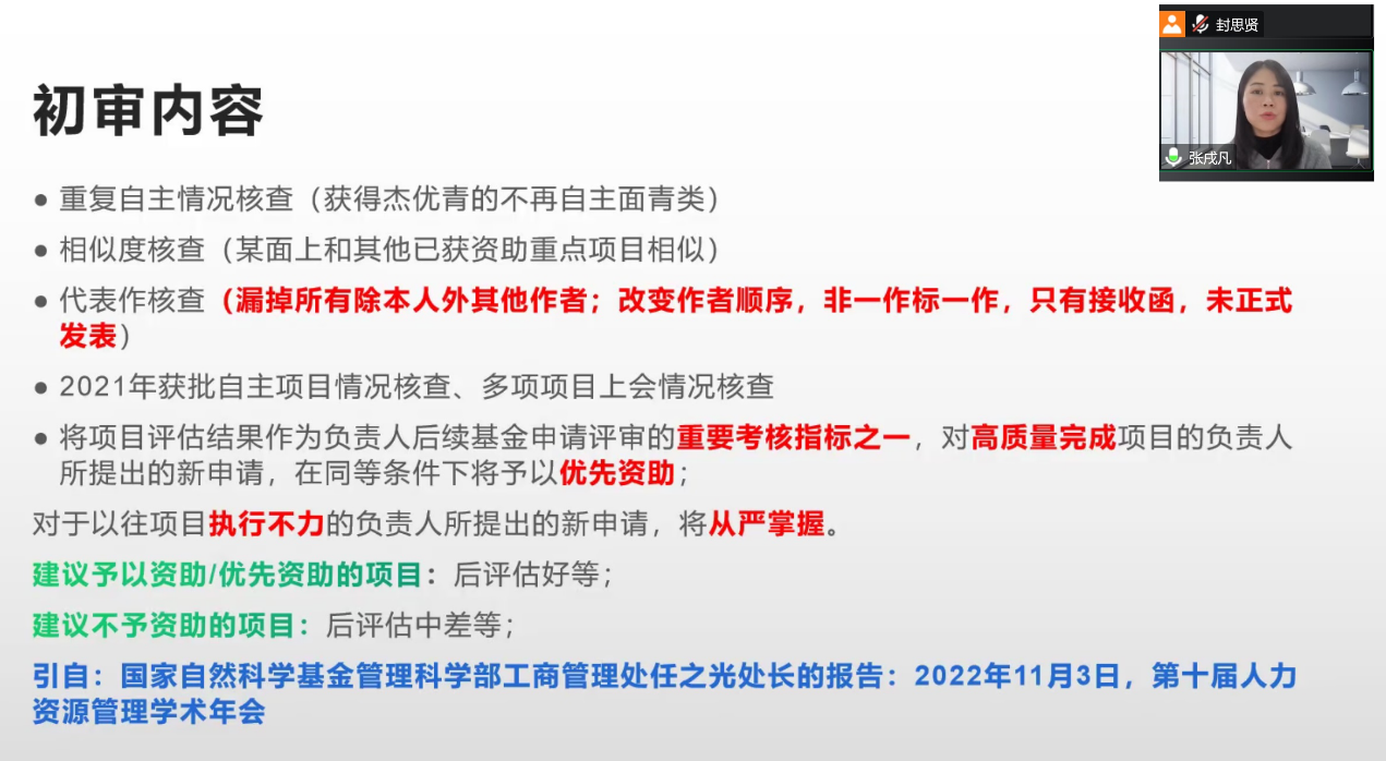 张戌凡教授接着结合自身多年通讯评审国家自然科学基金项目的经验,介绍了项目若要顺利通过初审的具体指标以及上会评审的基本条件,特别强调了其中的学术道德和科学规范要求,并提醒科研人员要尽最大努力高质量完成好正在从事的国家自然科学基金项目,只有这样才能在后续的再申报中获得声誉认可和竞争优势。在选题方面,要体现出创新性、科学性,能给评审人陌生度、新奇度和兴趣度,选题应兼顾学术之需和社会之需,不宜用晦涩难懂的语言来过于追求所谓的学术化。在内容和版面方面,要体现出严谨的逻辑性、严苛的认真性和绝对的真实性,充分论证好项目按照预期目标完成的可行性。她特别强调,管理科学部近年来面上项目最终获得资助的比例只有申报数的20%左右,竞争激烈,只有从选题、内容设计、逻辑安排、方法选择、甚至是版面等多个方面系统化地严格要求,才有可能获得从众多申报中者中脱颖而出的机会。要想做到这些,申报人不能只顾一头闷着写申报书,还要不断向学界请教,经常参与学术交流,接受来自各方面的宝贵指导。