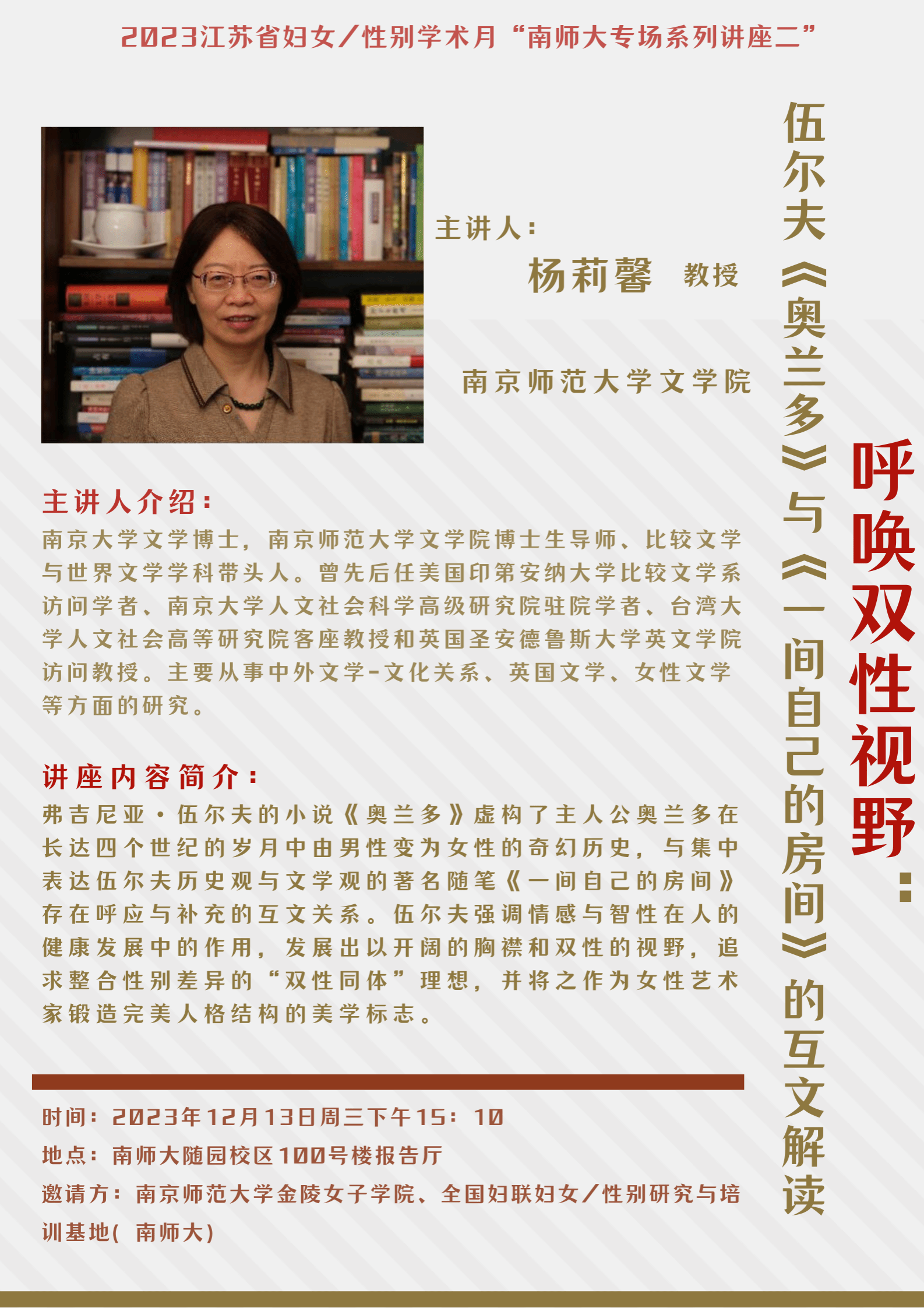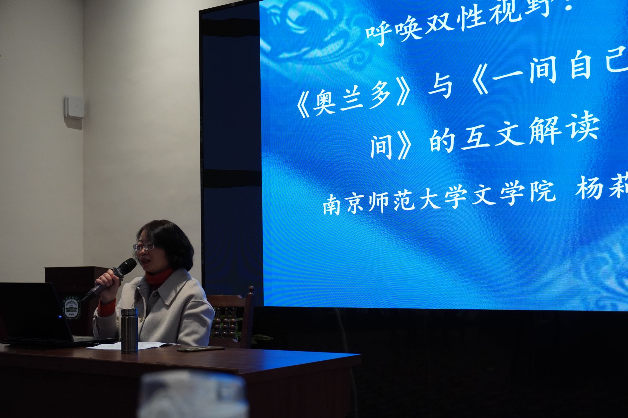 1213日下午,江苏省“妇女/性别研究学术月”百家乐平台 专场第二场讲座在百家乐平台 随园校区100号楼举办。此次讲座邀请了南京大学文学博士、百家乐平台 文百家乐平台博士生导师杨莉馨教授来分享关于伍尔夫《奥兰多》与《一间自己的房间》的互文解读,并与在场的学生进行文学思想的对话。