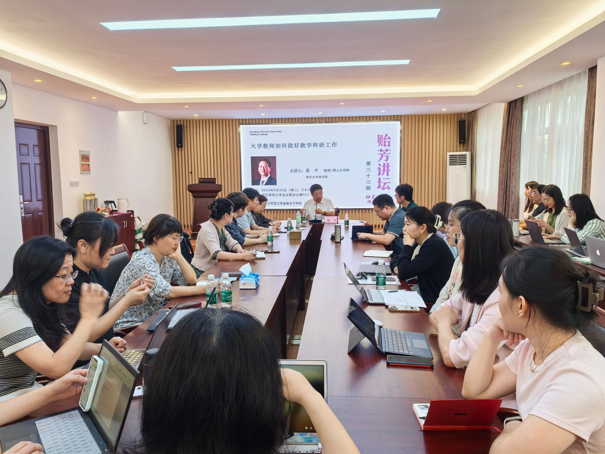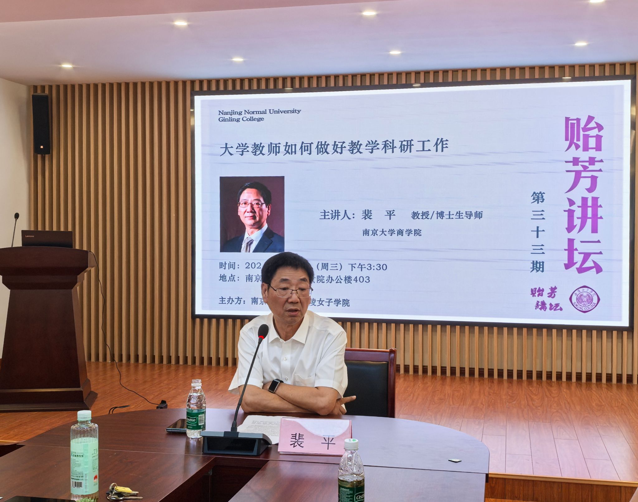 2024925日下午,在随园校区金女院403会议室举办贻芳讲坛第33期学术讲座。本期贻芳讲坛邀请南京大学裴平教授为全院老师讲授“大学教师如何做好教学科研工作”。讲座由副院长封思贤主持,全院领导、老师和部分学生代表参加了此次讲座。