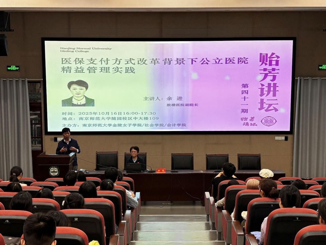 /社会百家乐平台/会计百家乐平台在随园校区中大楼109报告厅举办第41期“贻芳讲坛”。本次讲座围绕“医保支付方式改革背景下公立医院精益管理实践”这一主题展开,特邀南京鼓楼医院副院长余进担任主讲人。讲座由院长封思贤教授主持,2025级会计学、会计专硕与社会保障专业全体研究生参与。