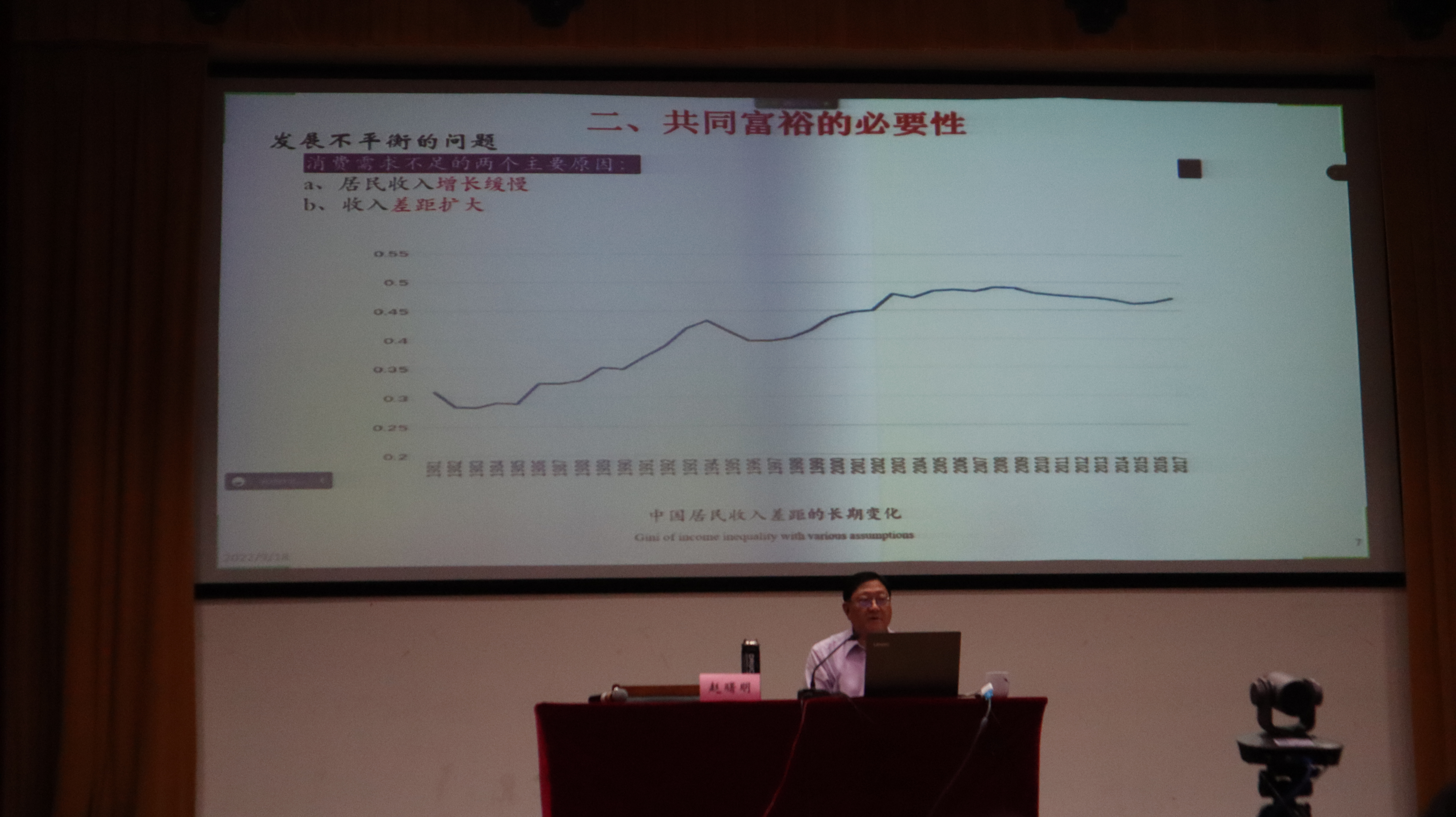 谈到实现共同富裕路上面临的挑战,赵教授指出,要首先认清我国目前经济仍处于全球中等水平、收入差距过大、财产差距急剧扩大,中等收入群体规模依然存在着偏低、公共服务均等化程度不高且地区差异明显的问题。针对这样的现状,赵教授提出了自己对于实现共同富裕方法的理解:为了经济科技文化有效的发展,增加中国在国际上的话语权,向国际证明中国特色社会主义的优越性,我们需要培养国际化的人才。在此基础上,增加物质资源的供应、进一步提高公民的收入以实现人的物质发展;投入时间与医疗资源、提高资源使用效率与国民的健康意识以实现人的体魄发展;营造良好社会环境,引导国民提高奋斗意识、树立正确价值观、培养自身的责任意识,以实现人的精神发展。