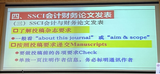 谭文浩副教授针对SSCI会计与财务论文的投稿与发表问题,向大家演示了查询期刊是否被SSCI收录的流程以及如何判断期刊是否是开源期刊,并叮嘱同学们在明确发表刊物级别的基础上,了解投稿杂志的要求、投稿前按要求递交原稿、写好投稿附言。