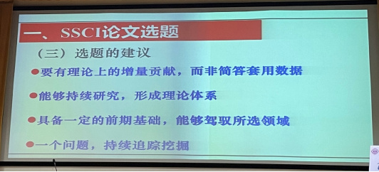 首先,谭文浩副教授指出国内的市场体系、制度规则不同于欧美国家,因此,论文选题不仅要关注到国际主流,更要注重中国问题,突出中国独特的制度背景。在进行SSCI期刊的投稿时,研究主题的普适性也不容忽视。对于选题的相关建议,谭文浩副教授认为在具备一定的前期基础的前提下,所选题目要有理论上的增量贡献,而非简单套用数据,并且针对某一选题要能够持续研究、不断挖掘、形成理论体系。