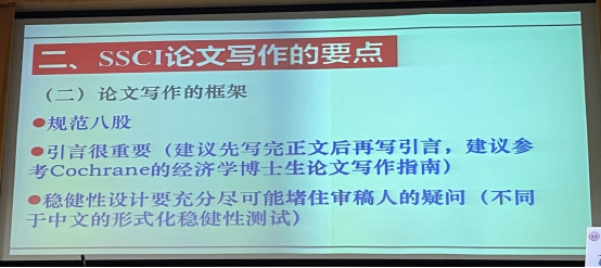 在本次讲座的尾声,谭文浩副教授以自己投稿的一篇历时20个月的论文为例,鼓励大家大胆尝试高级别的杂志、尊重审稿人并积极与编辑部进行沟通。金女院副院长封思贤教授强调了本次讲座的“扫盲”意义,提醒大家注意论文的规范性,熊筱燕教授呼吁大家静心钻研、认真读书。最后本次讲座在同学们的热烈掌声中圆满结束。(沈雨 供稿)