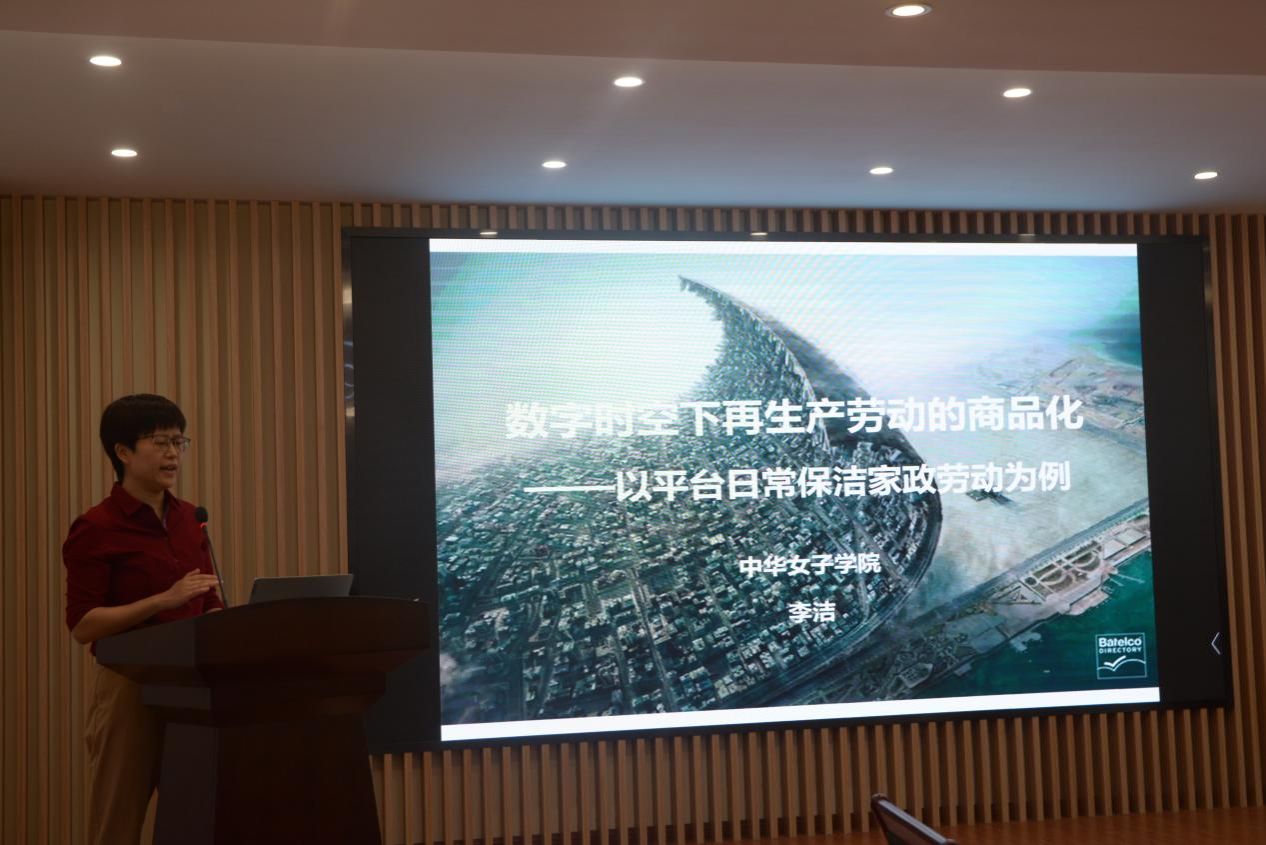 金一虹老师主持。她简要介绍了主讲人李洁教授的学术经历,以及此次讲座主题相关背景,如互联网平台兴起、再生产理论、家政劳动的新特点等。