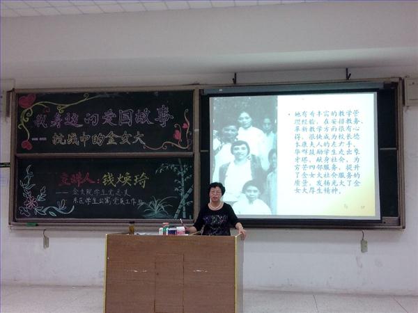 “我身边的爱国故事传奇——抗战中的金女大”爱国主义专题讲座。由金女院吴贻芳研究所所长钱焕琦教授为同学们讲述金女大师生在那血雨腥风的年代里可歌可泣的爱国传奇历史。
