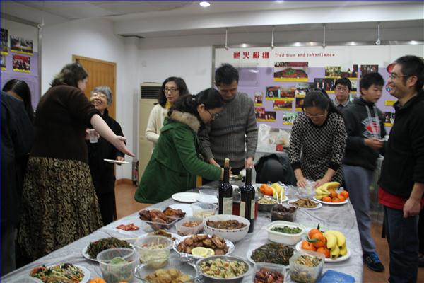 本次活动教师们参加热情很高,大家带来了自己的拿手菜:酱汁牛肉、烤鸡翅、豆豉排骨、菌菇虾仁烫干丝、冬阴功汤、菠萝饭、咸菜饭、四季豆焖面……,外教也带来了拿手的土豆泥、小西点,还有的教师现场做起了烙饼、包起了馄饨。现场气氛温馨,身在其境,真有一种家的感觉。美食品尝结束后,中外教师们进行了游戏活动和才艺表演,大家跳起了华尔兹、健身舞,外教弹奏起钢琴,聚会在“同一首歌”的歌声中结束。