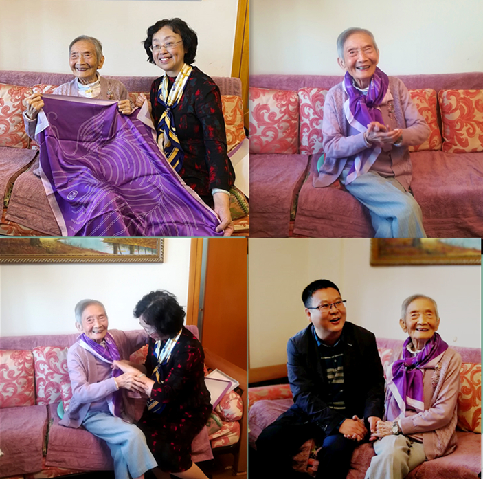 赵媛院长为王大姐送上印有金女院LOGO的围巾,老人好高兴,紫色是金女大、金女院的院色,深深浅浅的紫色,都是校友们的最爱!