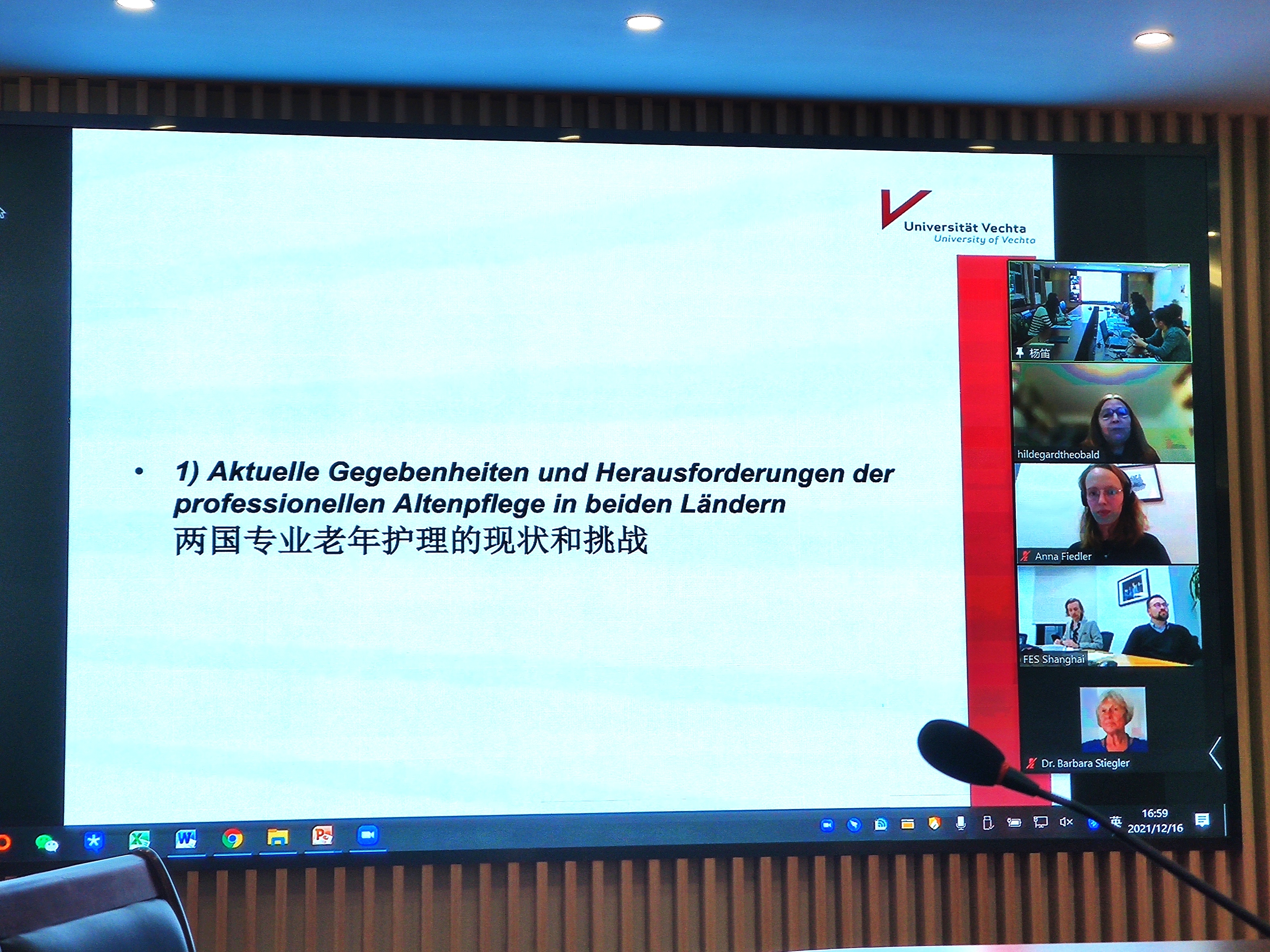 雷柏曼先生与赵媛教授分别介绍了艾伯特基金会和百家乐平台 的基本情况与研究计划,并对与会者的到来表示热烈欢迎。百家乐平台 金一虹教授和费希塔大学Hildegard Theobald教授分别就中德两国专业老年护理的基本情况进行了综合介绍。两位学者围绕两国老年护理的现状与挑战、培训与工作条件、机构护理的优势和劣势等内容对两国的共性和差异进行了简要汇报。随后,与会人员就两国的对比性发现、政策经验的可借鉴性以及设置联合研究议题的可行性等问题进行了进一步的讨论和交流,针对论证的具体化、可比较的结构与共同的优先事项达成一致,并敲定了未来专题研讨会议的可选议题、会议程序与时间安排。最后雷柏曼及赵媛教授宣布本次讨论会顺利结束。