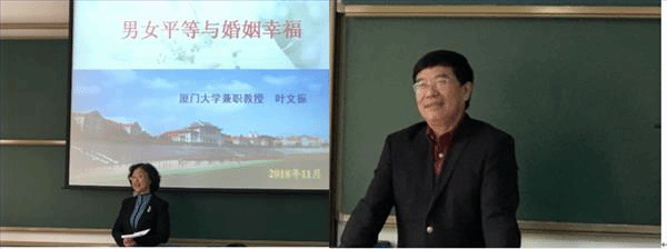 叶教授在讲座中一再强调男女平等对于婚姻幸福的重要性,并提出他对于男女平等的理解是“男女平等的核心是人格上的平等与互为尊重;男女平等的关键是过程的平等,为追求一样的结果,不需要更长的过程、更复杂的经过、也不需要付出更多的代价;男女平等的目标是认识和发挥性别的比较优势、实现性别组合的关系和谐与利益最大化;男女平等的原则不是制度的刚性约束,而是文化的软性自觉,是整个社会的主流价值取向、基本文明素质和重要道德修养;男女平等的特点是倡导性别之间的生理爱护,包括对生理循环、生育期间女性的关爱,对生理缺陷男性女性的关爱”。