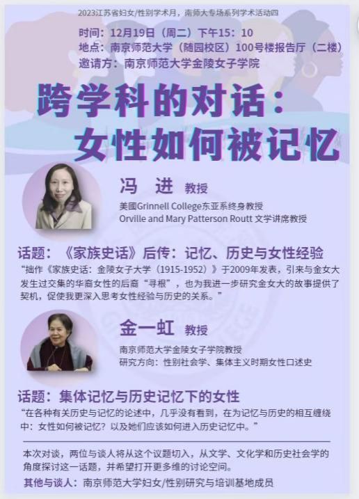 冯进教授主要研究领域为中国近现代文化、比较文学、女性研究等,英文专著有:The New Woman in Early Twentieth-Century Chinese Fiction (Purdue University Press, 2004), The Making of a Family Saga: Ginling College (1915-1952) (SUNY, 2009), Romancing the Internet (Brill, 2013)。曾发表《家族史话:金陵女子大学(1915-1952)》,引来与金女大发生过交集的华裔女性的后裔“寻根”,另有多篇中英文学术论文发表。目前研究聚焦于中国当代流行文化、饮食文化等领域。金一虹教授研究方向为性别社会学、集体主义时期女性口述史,主要著作有《父权的式微——江苏农村现代化进程中的性别研究》《世纪之交的中国妇女与发展》《女性叙事与记忆》等。目前研究聚焦于集体主义时期女性口述史,致力于深挖集体记忆与历史记忆下的女性。
